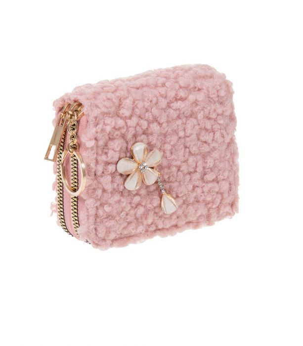 Vaaleanpunainen lompakko teddykangasta. Lompakossa on kaksi erillistä, vetoketjulla suljettavaa osiota, jotka pitävät tavarasi järjestyksessä ja helposti saatavilla. Toinen osio sisältää paikat korteille ja kolikoille. Toinen osio on varustettu kätevillä lokeroilla, jotka sopivat seteleille, kuitteille ja muille pienille tarpeille. Kyljessä kukkakoriste, kullansävyiset vetoketjut ja avainlenkki jolla lompakon saa kiinni esimerkiksi laukkuun. Koko 10 x 12 x 4cm.