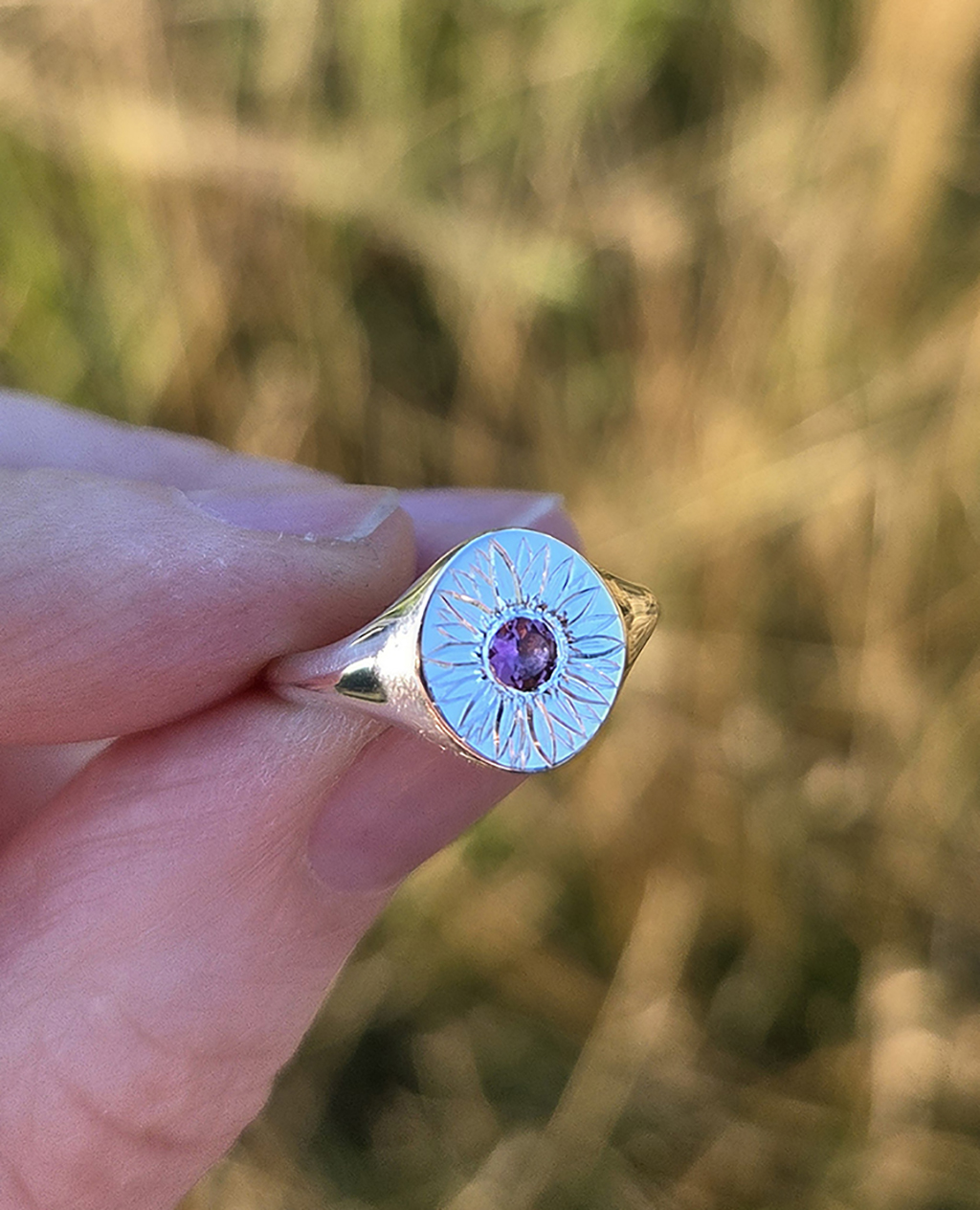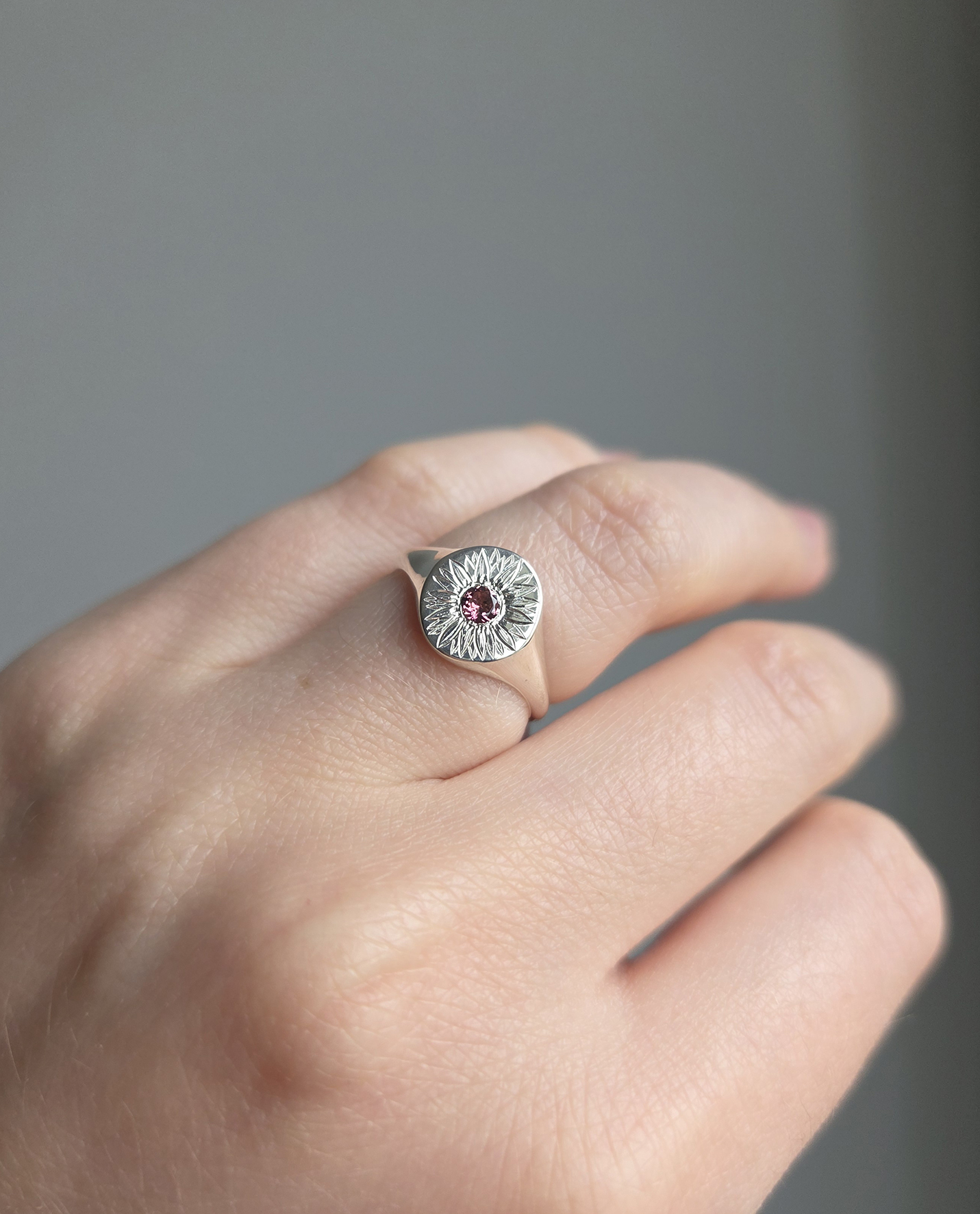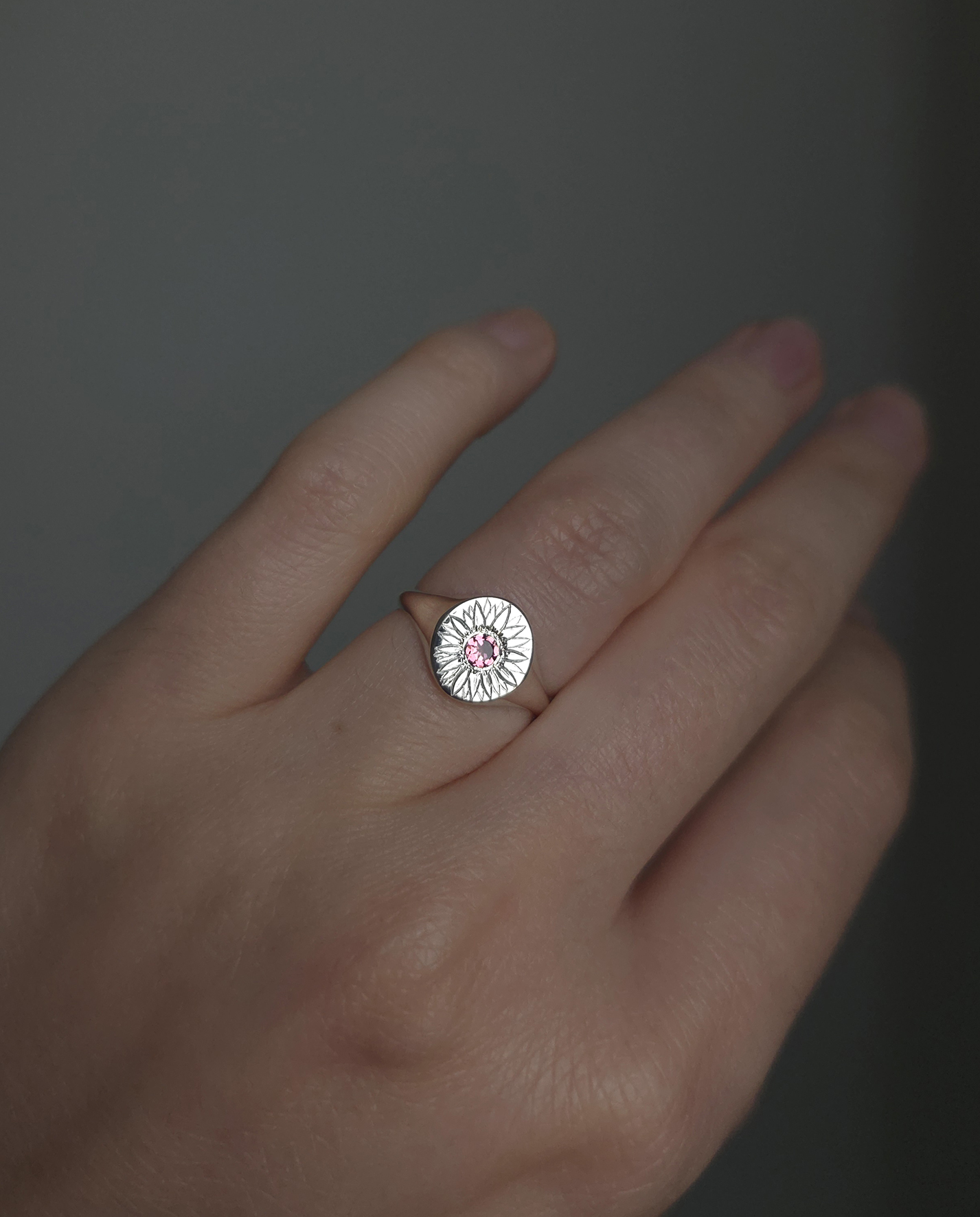 ◦ Handcrafted from recycled 925 sterling silver. ◦ Set with a natural pink 0.15‑carat tourmaline. ◦ You can wear it as a pinky ring or on any other finger. ◦ Size 16.2 is in stock and available for immediate shipment. Any other size can be made to order within 10 business days.