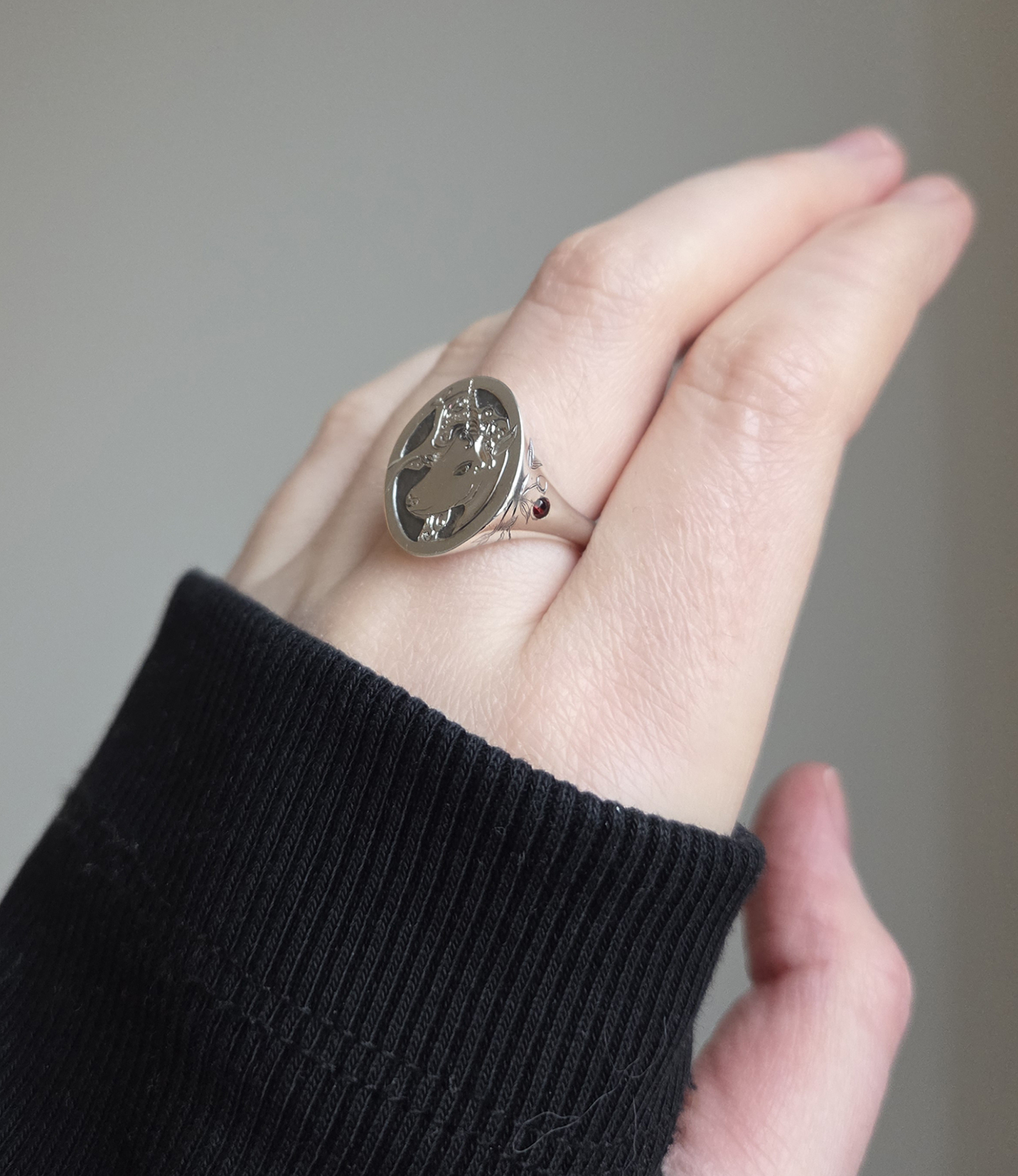 ◦ Handcrafted from recycled 925 sterling silver. ◦ Hand engraved and set with a natural garnets. ◦ Size 17.5 is in stock and available for immediate shipment. Any other size can be made to order within 15 business days.