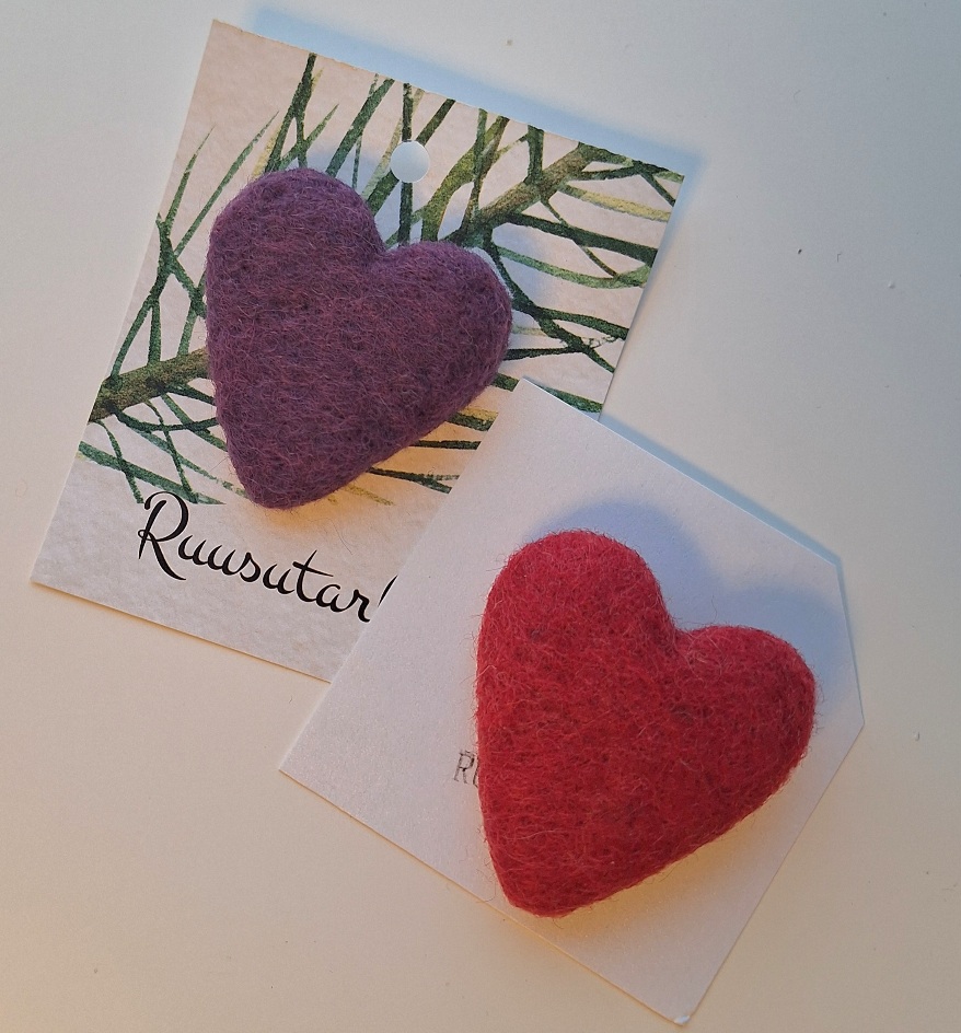Kahden sydämen setti lila+punainen Sydänten koko noin 5cm(+-). Takana neulakiinnitys.