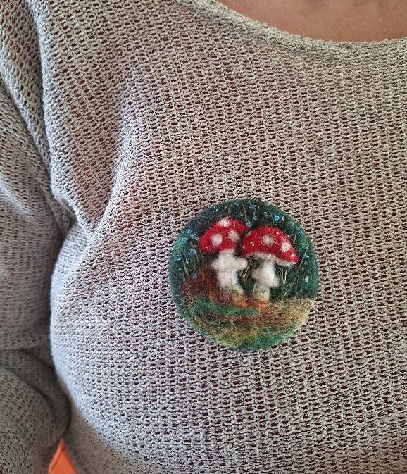 Asustekoru sienet, kärpässieni aiheella. Koko noin 6,5cm takana neulakiinnitys. Huovutettu/kirjottu.