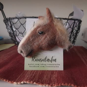Huovutettu asustekoru hevonen huiviin, lakkiin, takin kaulukseen. Valmistan myös kuvien mukaan. Hevosen takana on neula. Hevonen on noin 10 - 11 cm, pieniä koko eroja voi olla.
