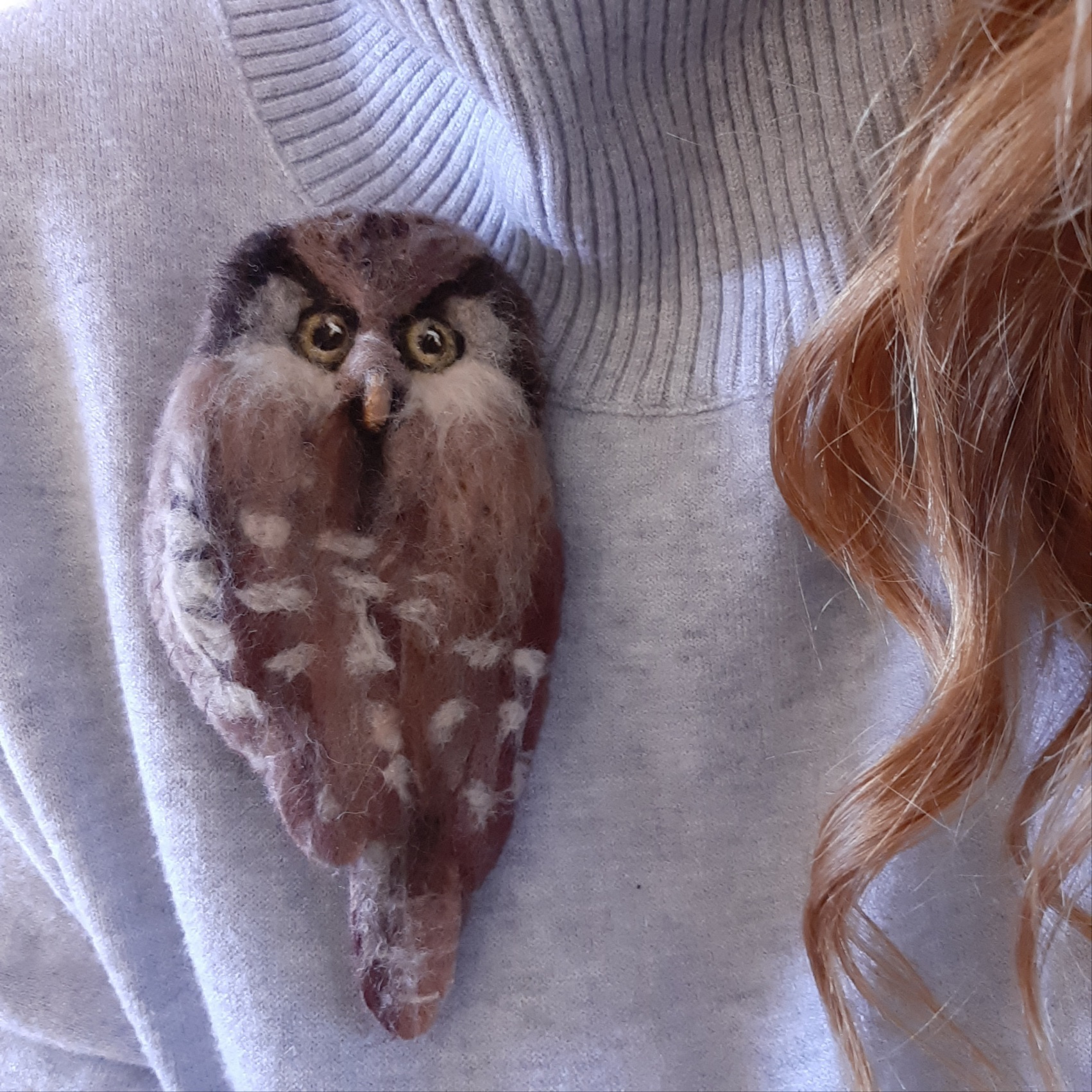 Tämä kuvan pöllö huhuilee omaa kotia. Pöllö on hieman isompi n.14cm. Sopii erinomaisesti takin liepeen jos etsit näyttävää asustekorua. Sopii myös miehille. Pöllön takana on neula.