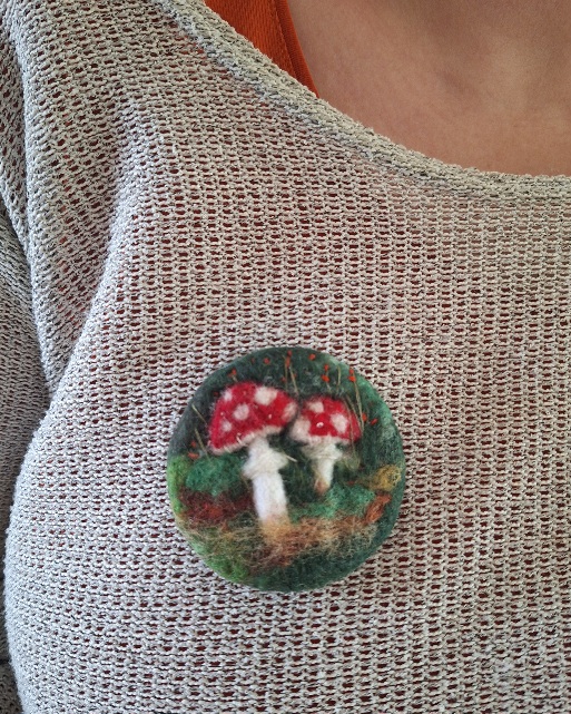 Asustekoru sienet, kärpässieni aiheella. Koko noin 6,5cm takana neulakiinnitys. Huovutettu/kirjottu.