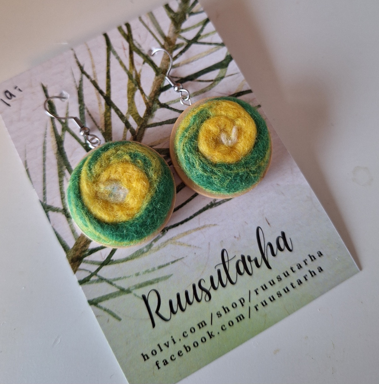 Kukkaa muistuttava kehä, huovutettu, kiinnitetty puunappiin. Kevyet. Halkaisija 3cm, pituus 5cm.