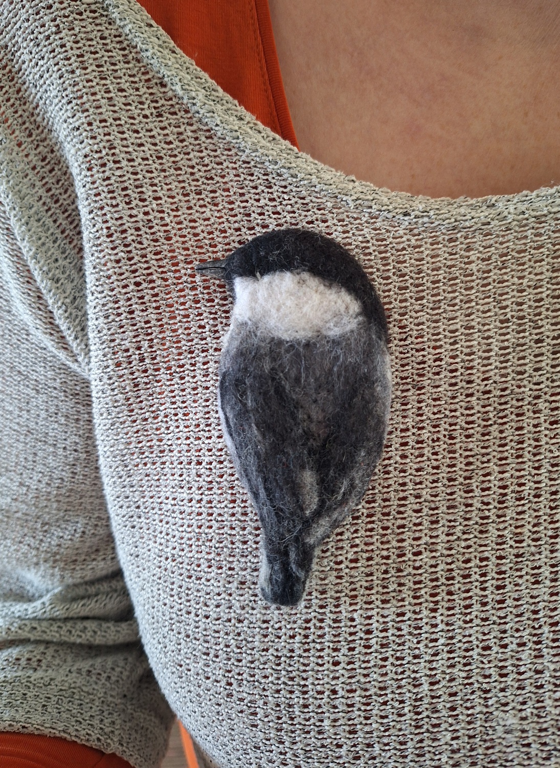 Asustekoru hömötiainen, koko noin 10cm. Huovutettu. Takana neulakiinnitys.