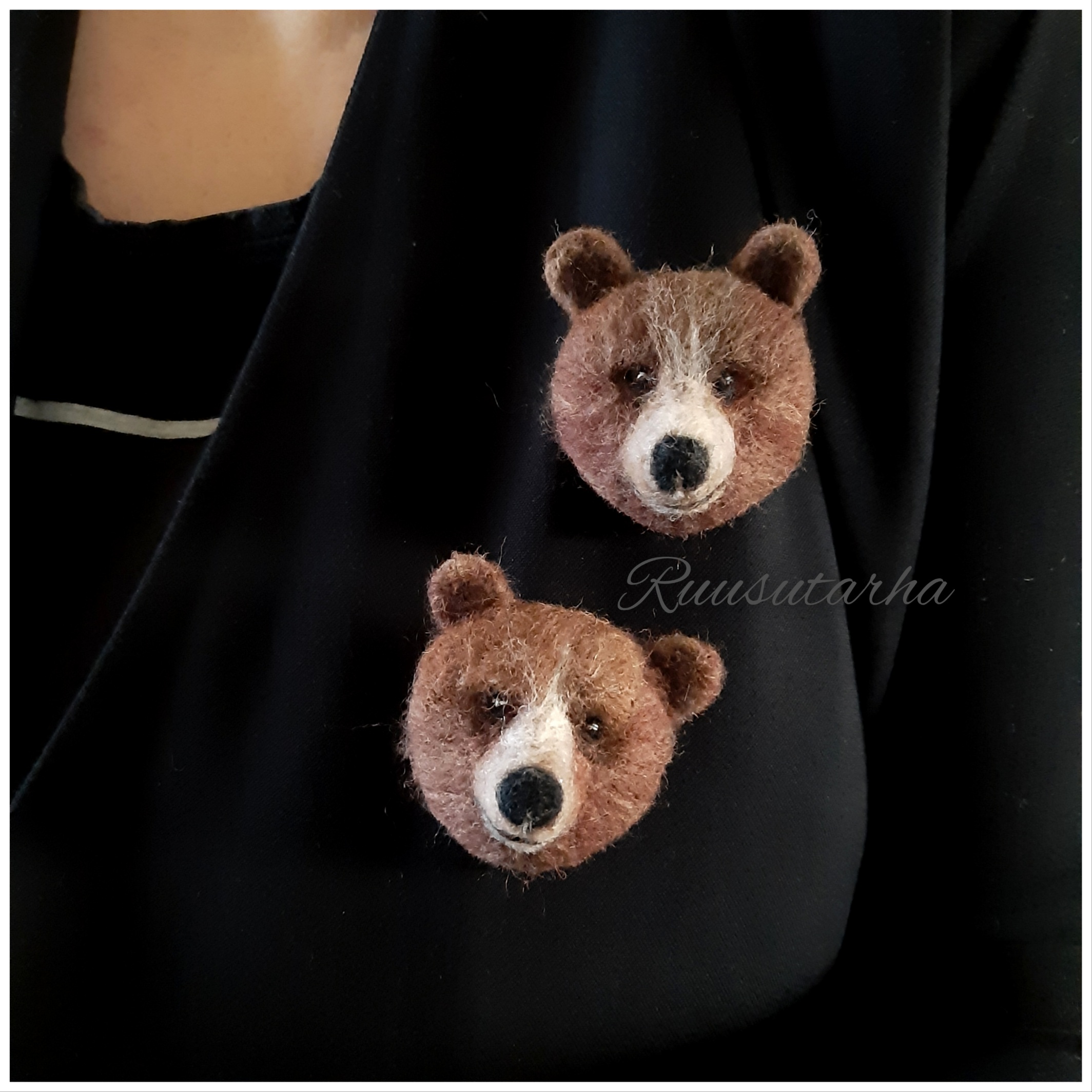 Kuvan karhut myynnissä yksittäin. Valmistettu huovuttamalla, ja takana on neulakiinnitys.