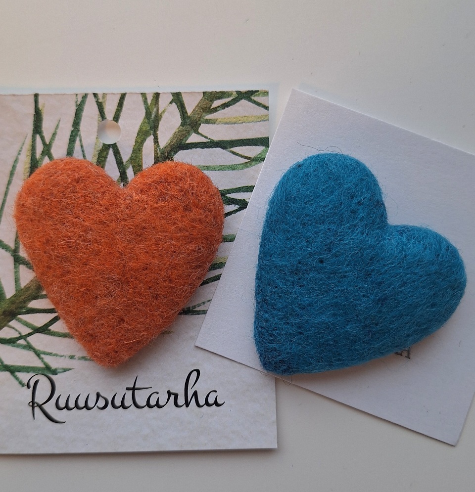 Kahden sydämen setti oranssi+ sininen Sydänten koko noin 5cm(+-). Takana neulakiinnitys.