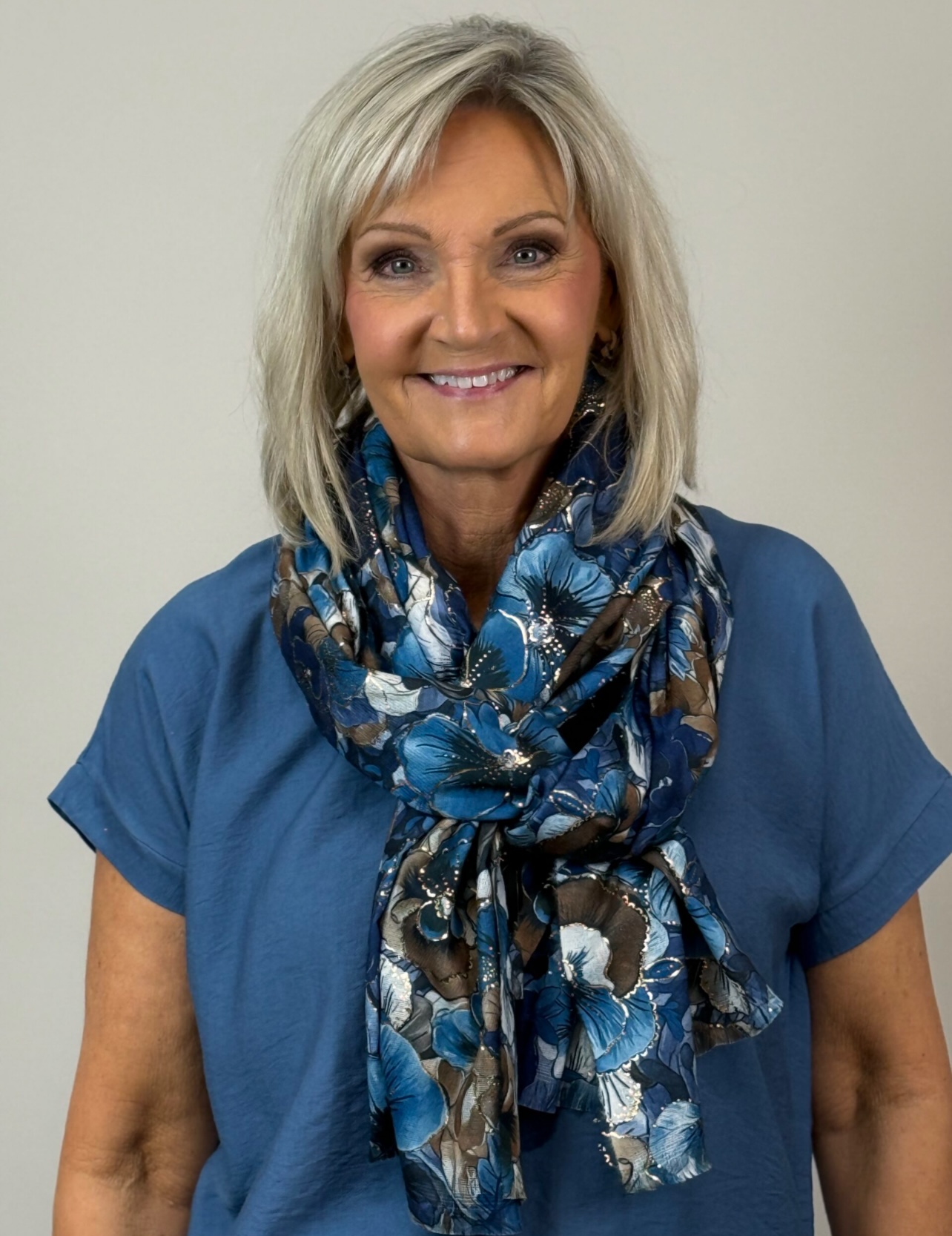 Kaunis sinipohjainen kukkahuivi. Huivissa on kaksi erilaista ilmettä: jos kaipaat säihkettä ja näyttävyyttä, pidä kultainen puoli näkyvissä. Maltillisempaa tyyliä varten voit käyttää huivia toisinpäin.