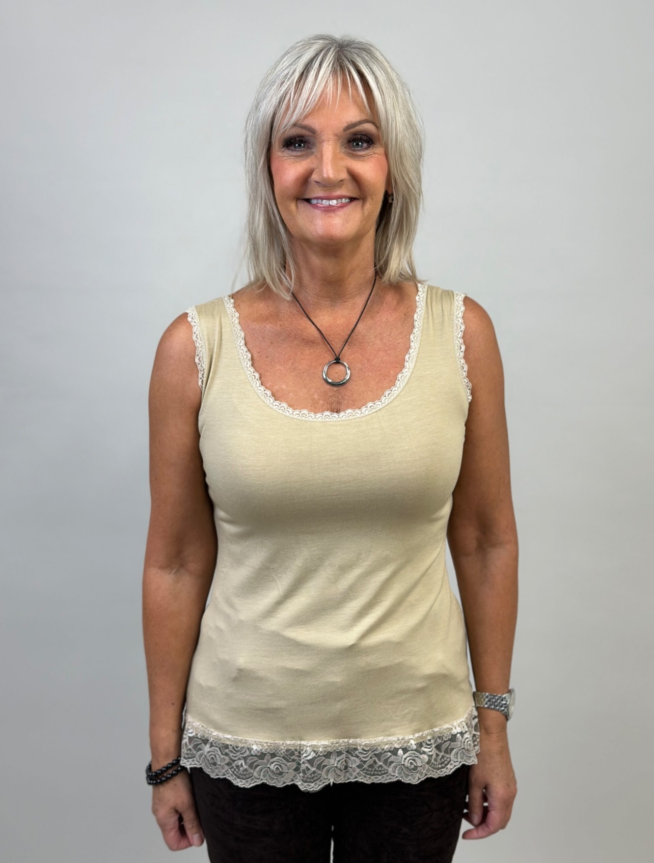 Materiaali: 95% viskoosia ja 5% elastaania Väri: beige Merkki: Mix By Heart. Koko: onesize (n 38-42/44) Mitat: Kainalo-helma n 50cm (pitsin alareunaan). Joustava.