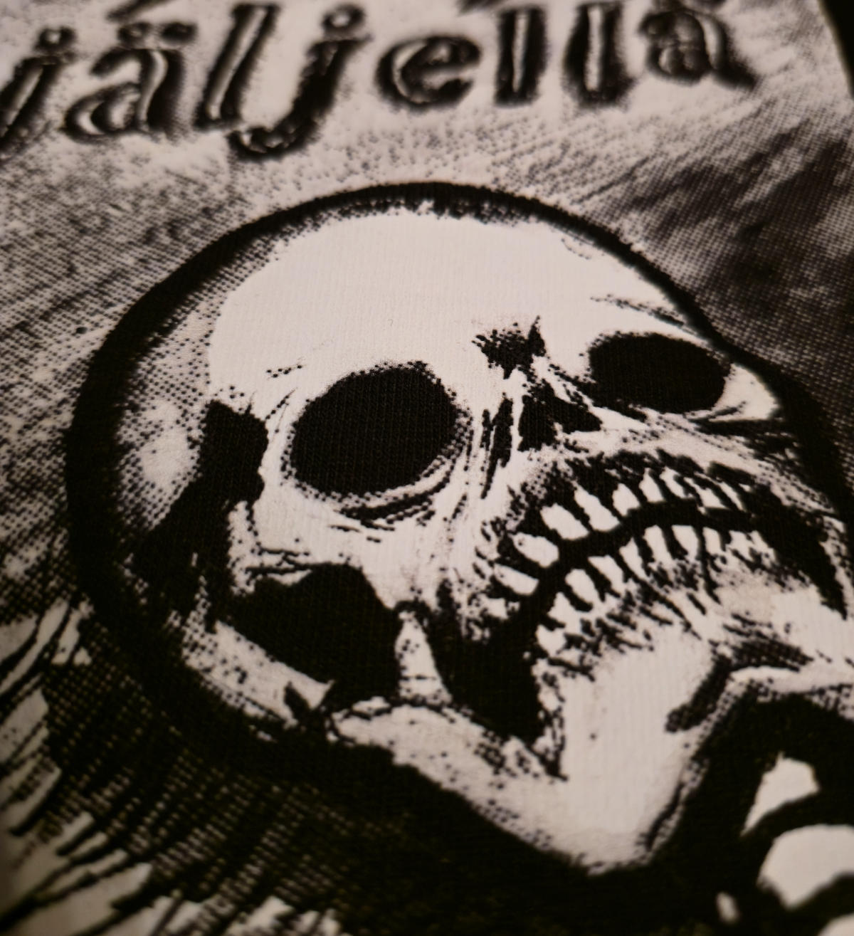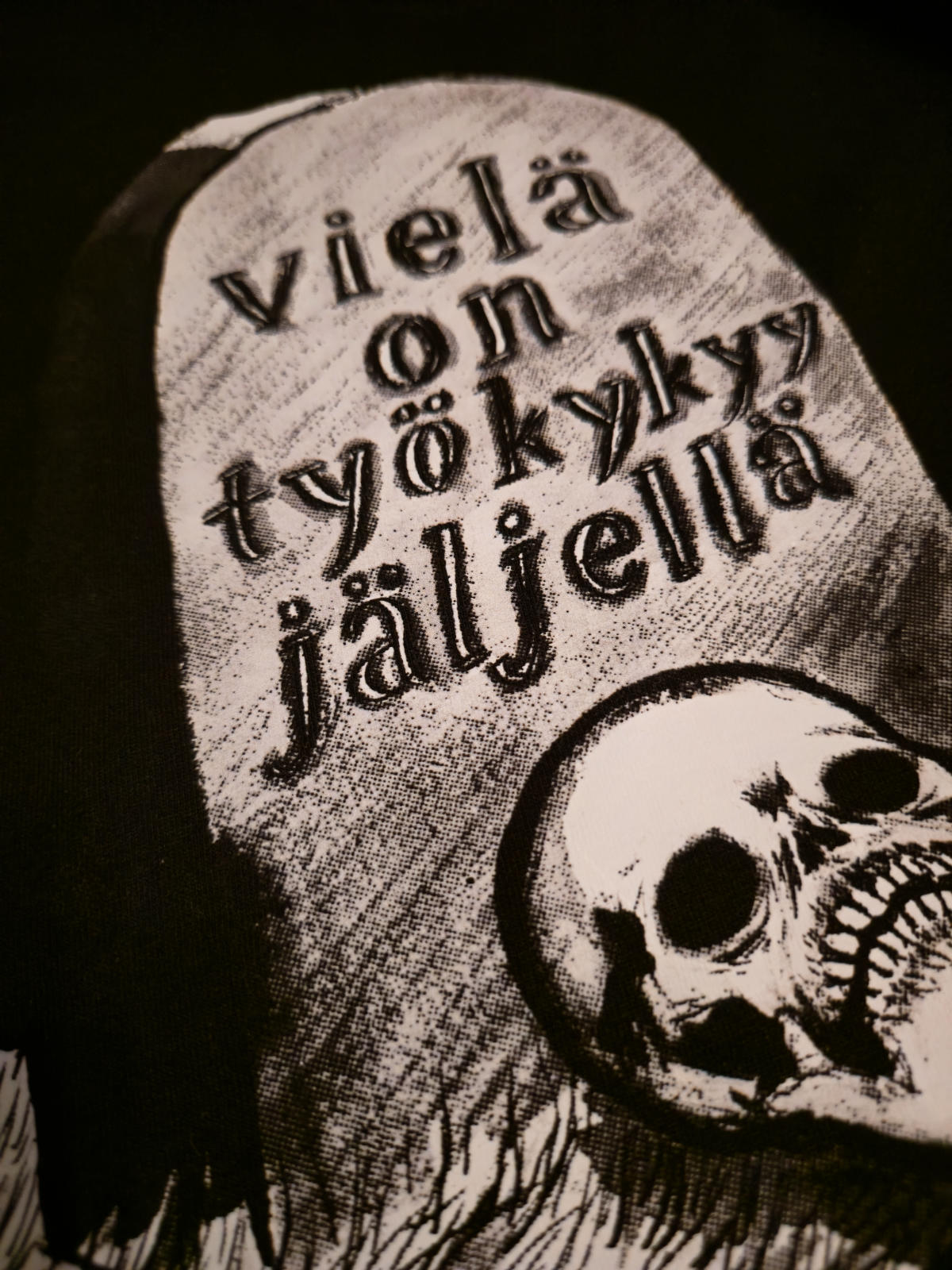 Tunnetuimman printtimme pohjalta painettu t-paita. Tällä kaverilla on vielä vähän työkykyy jäljellä. Alkuperäisteos on tehty musteella. Paidan kuva on rasteroitu mukavaksi, joten kuva "joustaa" ja näyttää hienolta.