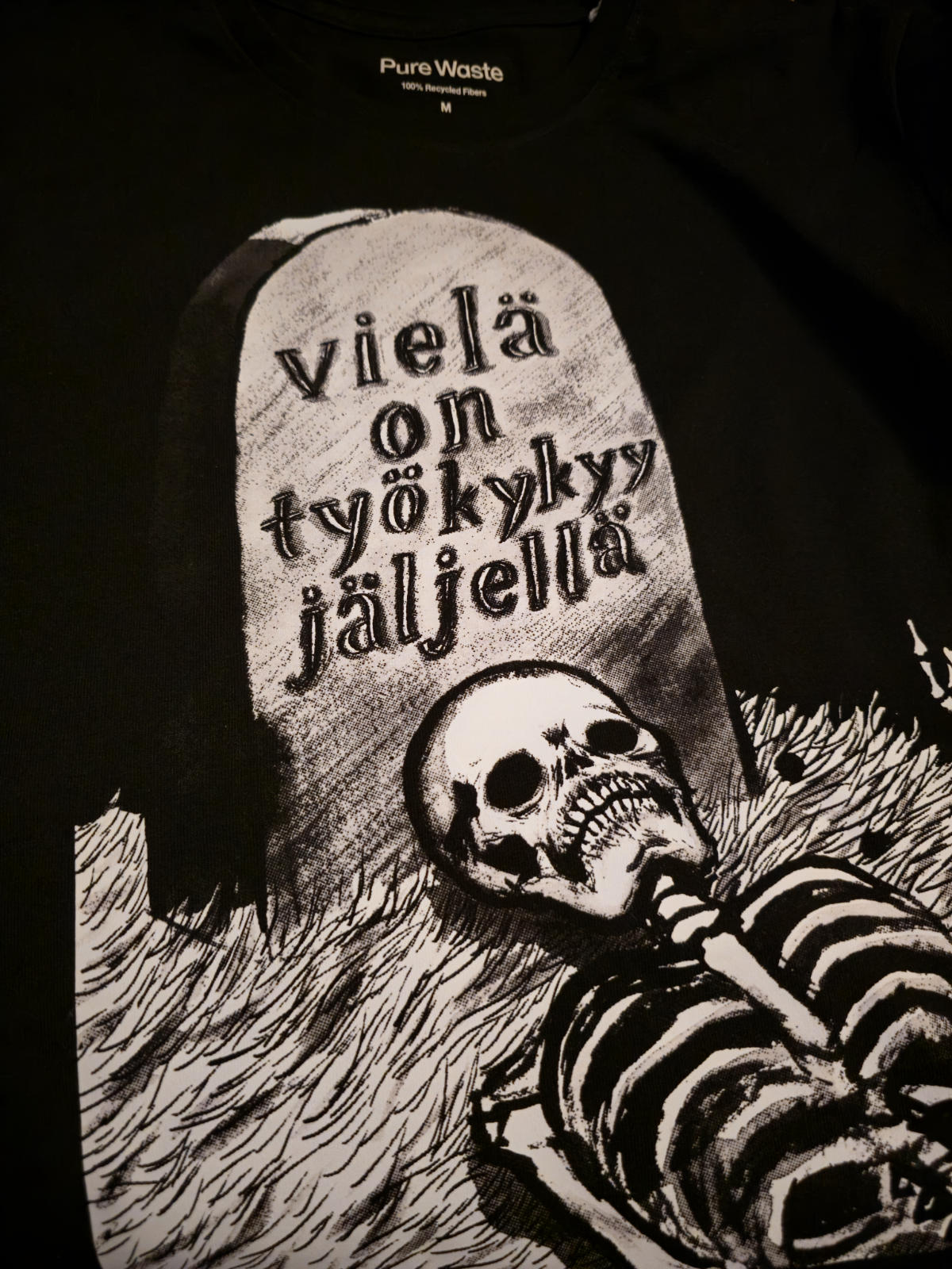 Itse paitojen valmistusmaa on Intia, voit lukea lisää PureWasten paitojen valmistusfilosofiasta täältä. Paidat painetaan Helsingissä Malmilla.