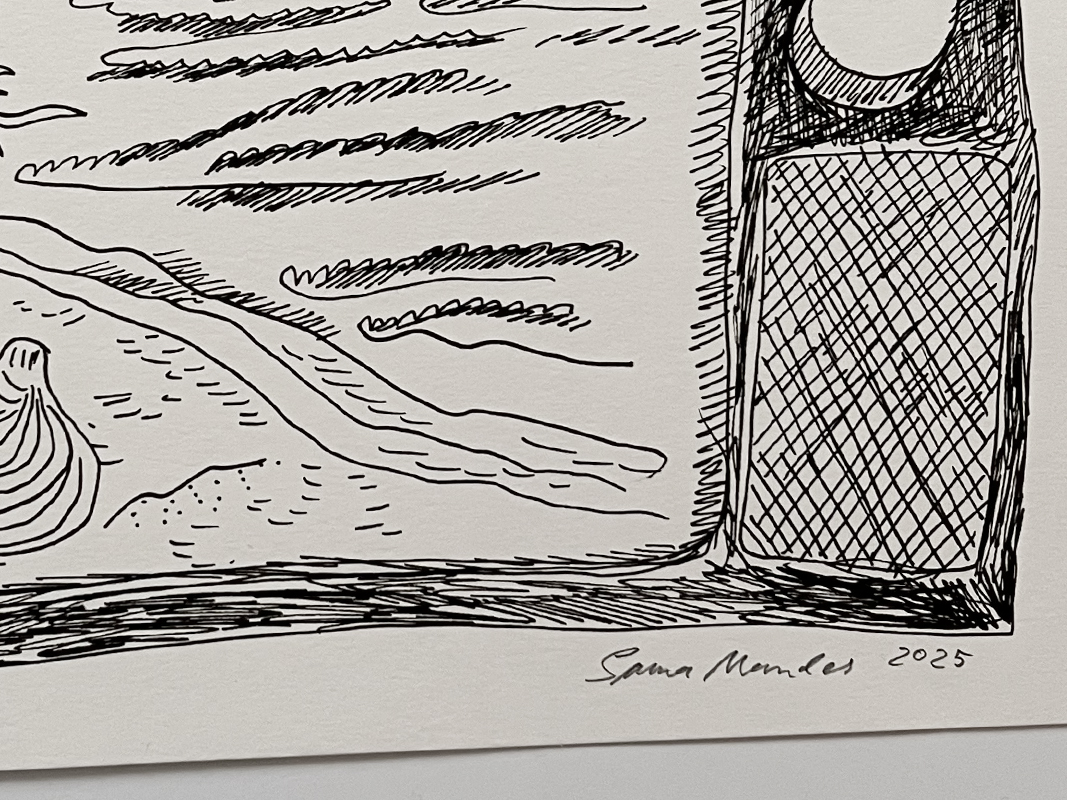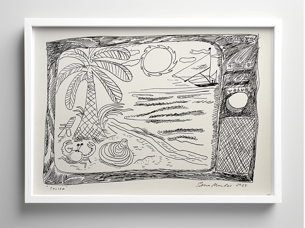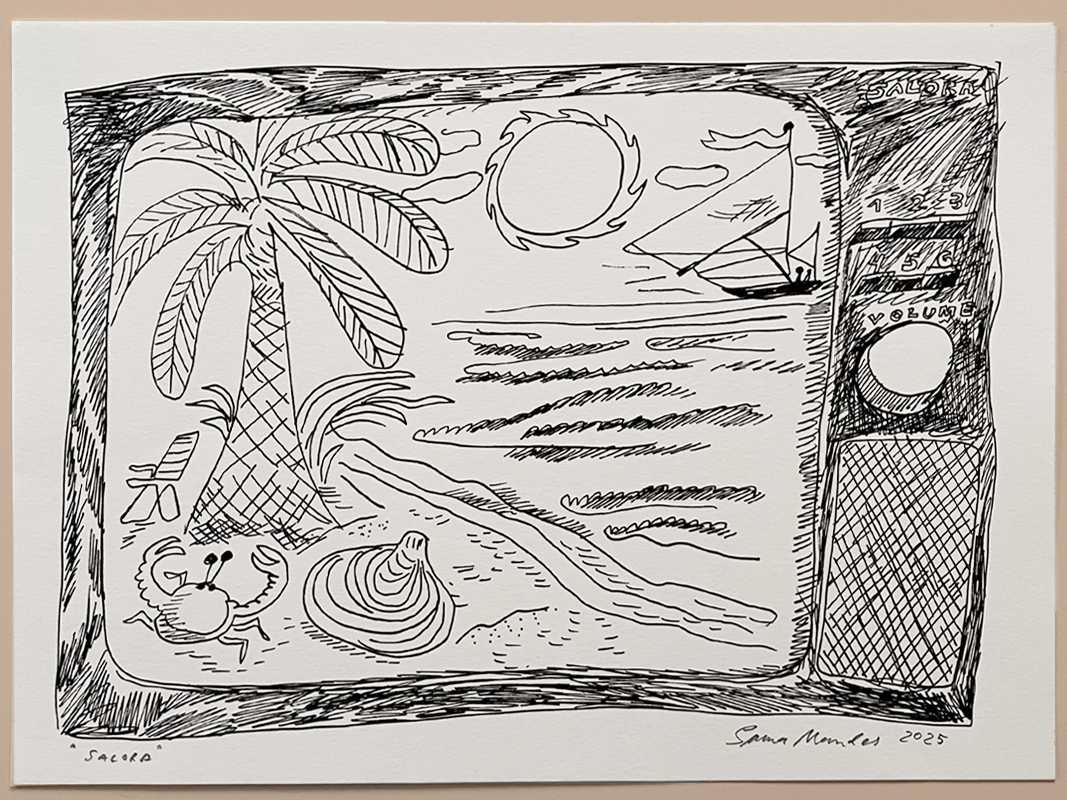 Original Fineliner Pen Drawing depicting a retro tv broadcasting live from a tropical beach, perhaps Panama? Size A4. Shipped with protective cardboard and a personal note. Frame not included.
