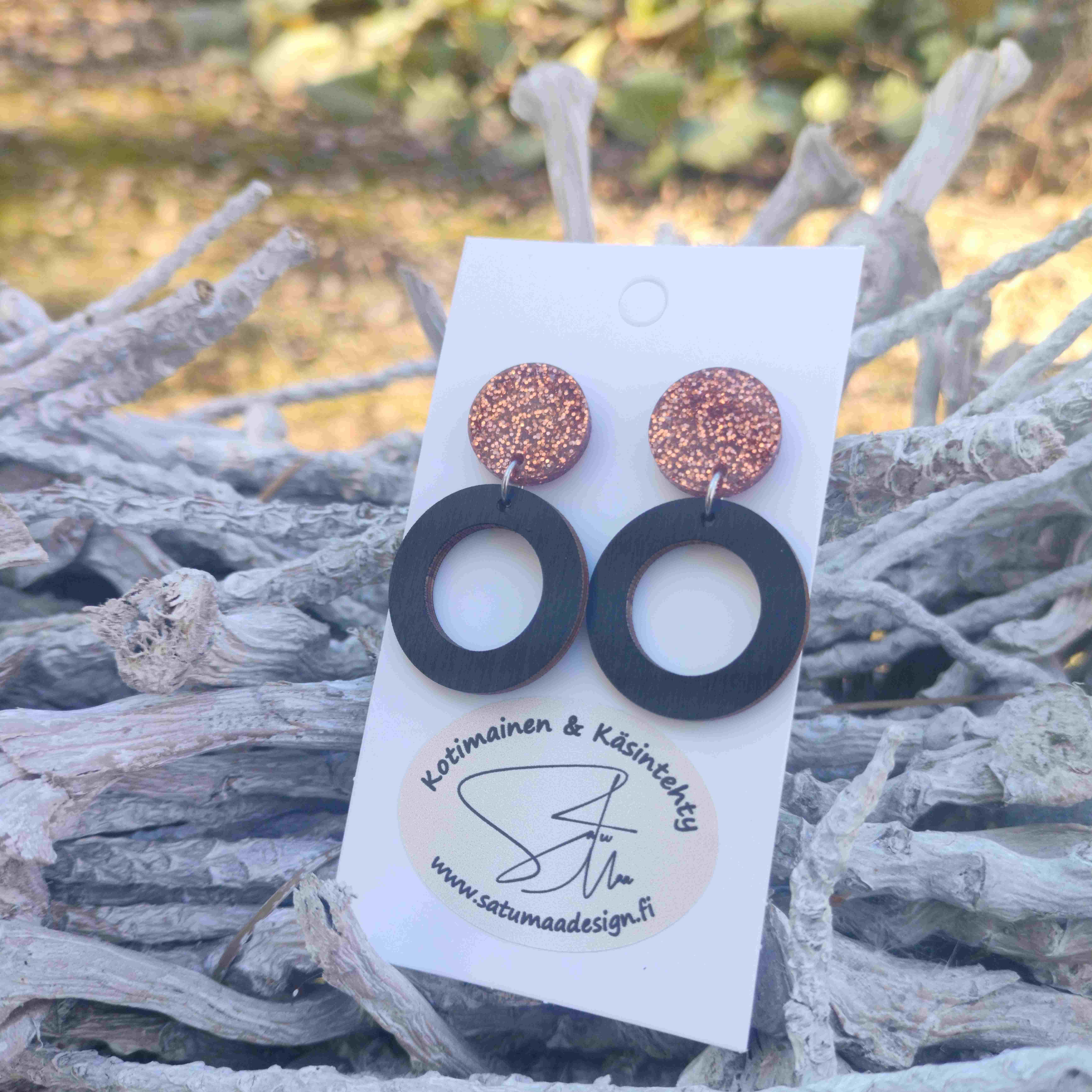 Minimalistisen tyylikkäät ja ajattomat. Nämä kaksiosaiset korvakorut yhdistävät pehmeän puun ja kiiltävän akryylin luoden elegantin kontrastin. Korvakorujen alaosa on valmistettu pehmeän sävyisestä koivuvanerista, joka luo lämpimän ja luonnollisen vaikutelman. Yläosa puolestaan kimaltelee glitterisen akryylin ansiosta.