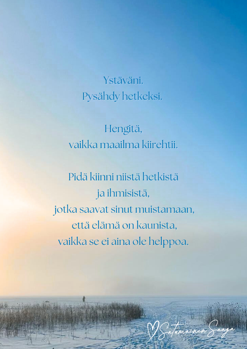 Ystävyys-aiheinen kuvitettu runokortti. Taustapuolella tilaa omalle viestille sekä osoiteviivasto. Korttien toimitus veloituksetta kirjatilauksen ja/tai noudon yhteydessä. Postitse minimitoimitus 20€ + postikulut.