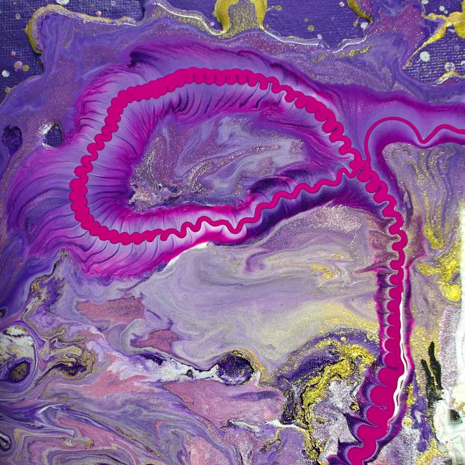 Tässä taidepajassa minä ohjaan sinulle tämän tekniikan – sen, joka on minulle itselleni mieluisa. Rakastan tätä tekniikkaa. Puhun aina värien tanssimisesta keskenään ja sitä tanssia on ihan mielettömän ihana katsella. Varsinkin tällä tekniikalla tehdyt taulut saavat usein ateljeella kysymyksiä, että miten ne on tehty. Niissä värit liikkuvat, sulautuvat ja elävät omalla rytmillään. Saat ohjata maalia niin paljon kuin haluat, mutta et koskaan täysin tiedä, mitä se päättää paljastaa – ja juuri siksi se on niin kiehtovaa. Yllä oleva kuva on otettu juurikin silloin, kun maalit vielä tanssivat.