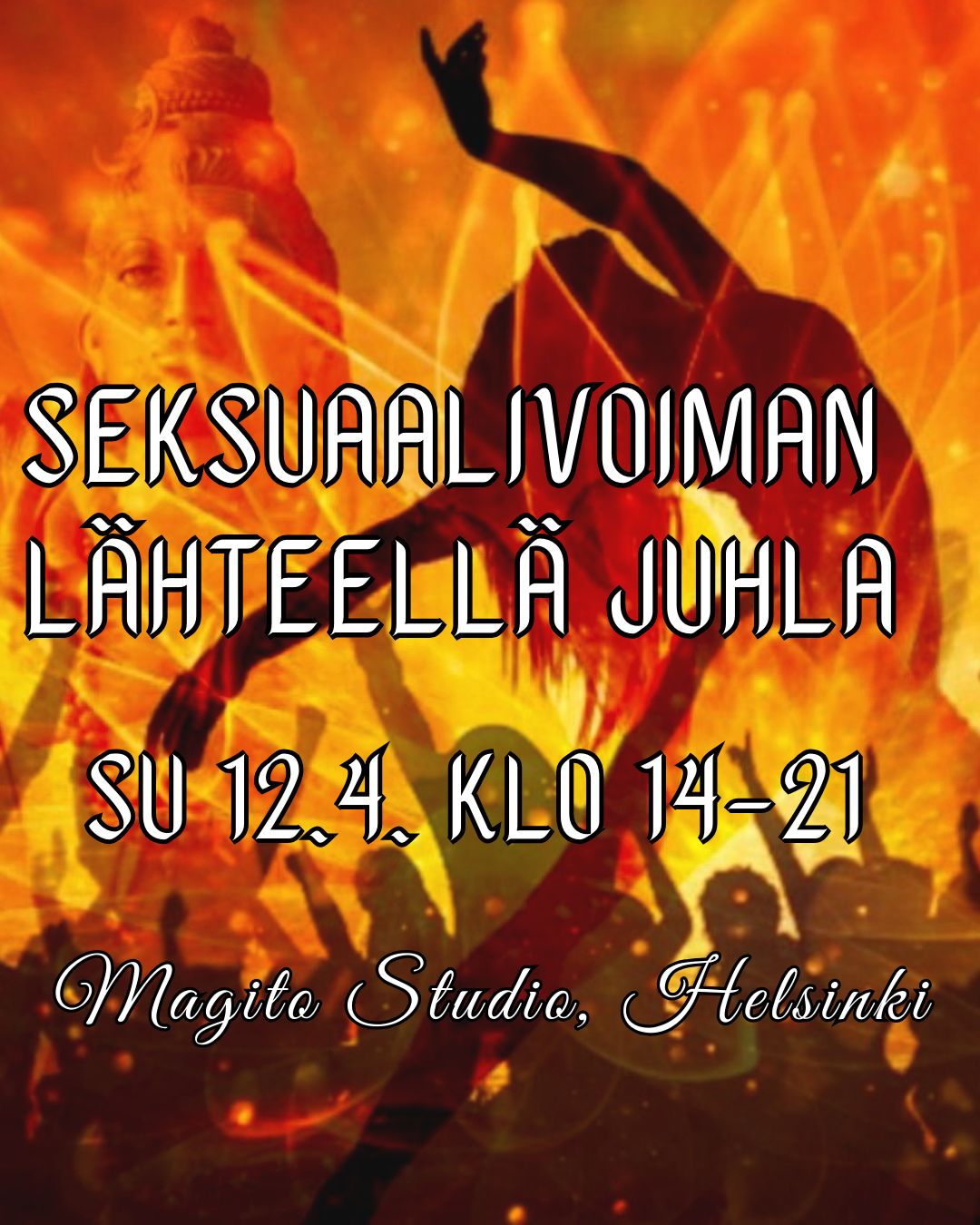 Palaa omalle lähteelle kokemaan aiheetonta iloa, elämisen riemua ja voimaa, pyhyyttä omassa itsessä ja toisissa myös kohtaamaan elämän nostattama kipu syvällä rakkaudella, myötätunnolla ja tuomitsemattomuudella. Se kaikki voima on sun sisällä kaiken aikaa. Kuinka tietoinen siitä olet kaiken elämän draaman keskellä? Oletko unohtunut etsimään polkua itseesi jostain muualta, kuin itsestäsi? Seksuaalivoiman lähteellä -juhla on syvä elämän ilottelu, herkkä, voimakas, villi, rakkauden täyttämä, yhdessä vietetty elämän hetki.
