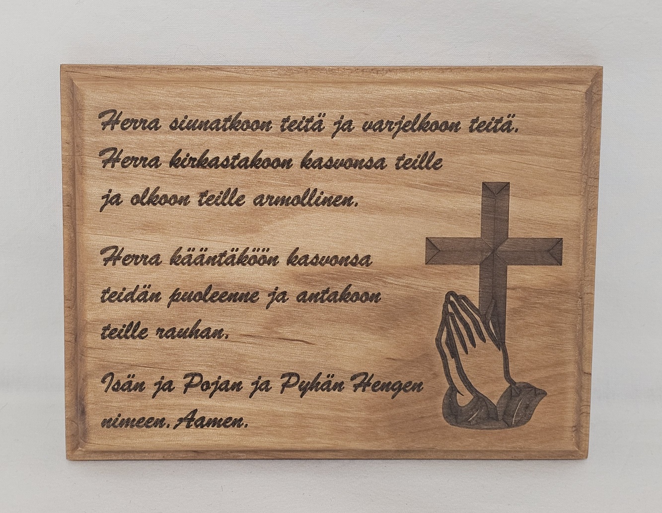 Käsityönä valmistettu tervalepästä. Pintakäsitelty parafiiniöljyllä. Koko: L 12 cm, K 16 cm Mukana taulun taakse kiinnitettävä "noja" koivuvanerista