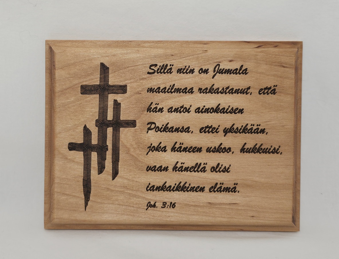 Käsityönä valmistettu tervalepästä. Pintakäsitelty parafiiniöljyllä. Koko: L 16 cm, K 12 cm Mukana taulun taakse kiinnitettävä "noja" koivuvanerista