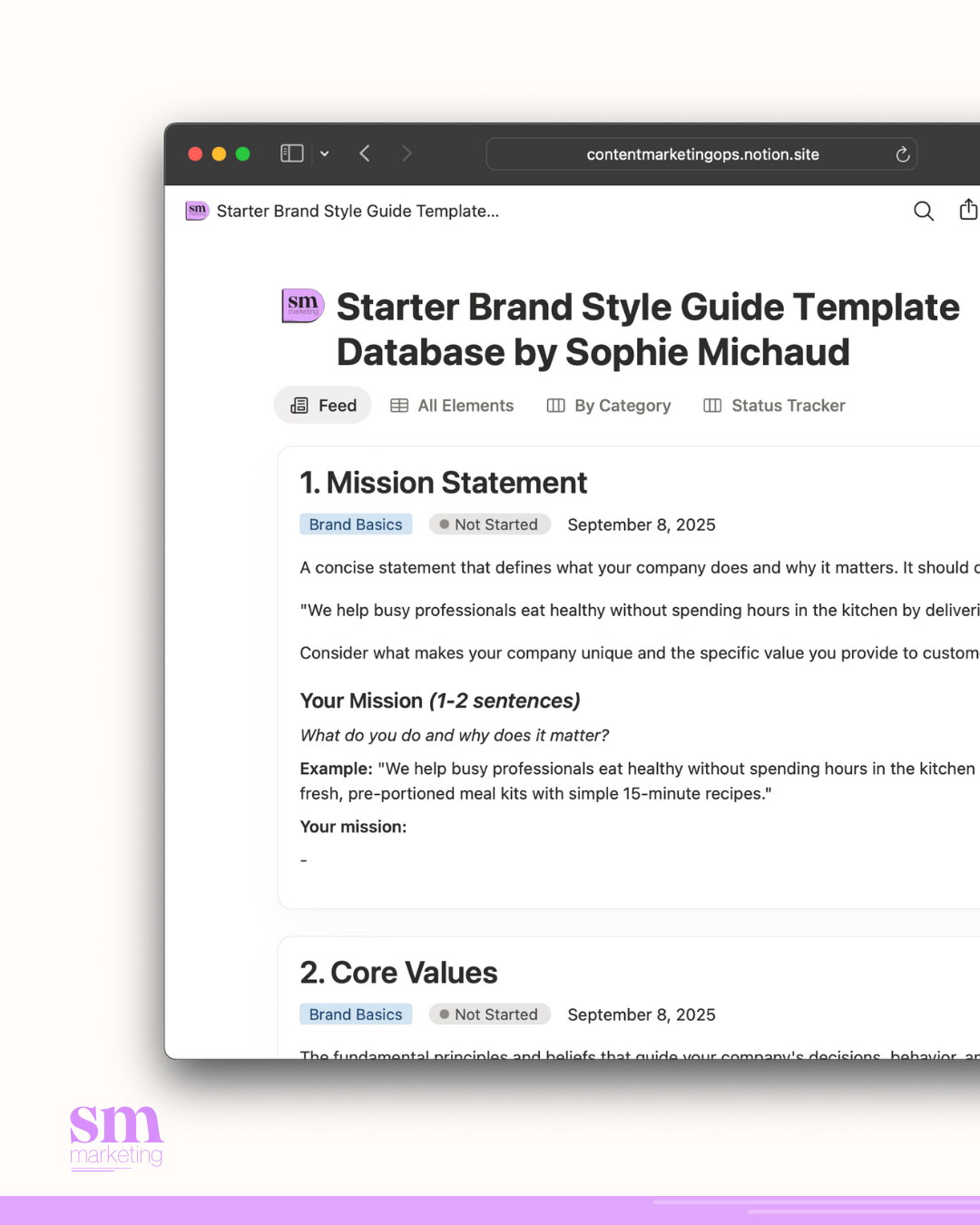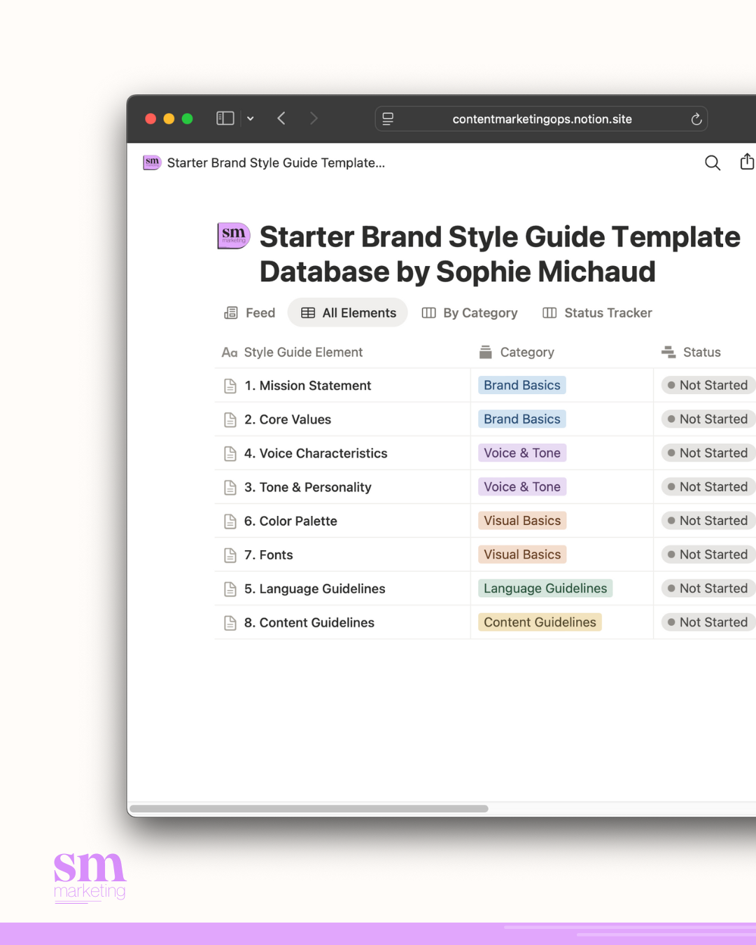 This starter Notion template is your toolkit for developing and maintaining a cohesive brand style guide. Perfect for entrepreneurs, small businesses, freelancers, and marketing teams who want to establish clear brand standards without the complexity.