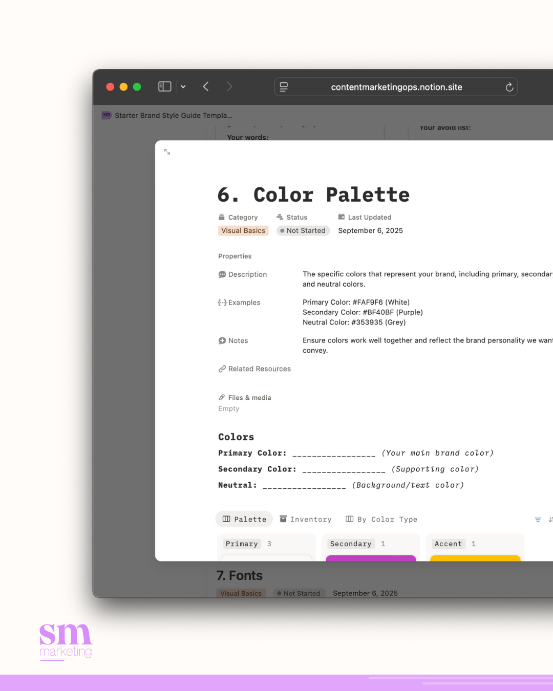 - Color Palette organizer with hex codes and usage notes