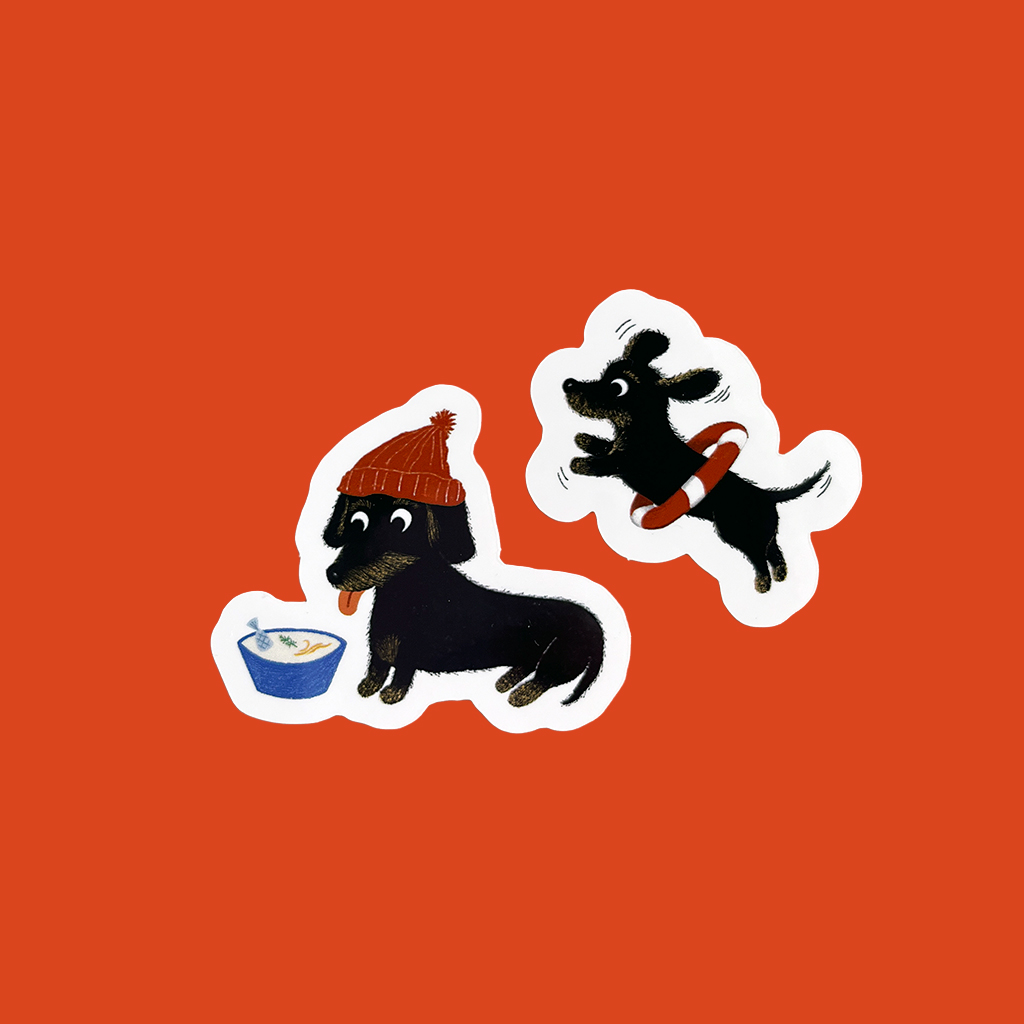 Vinyylipinnoitetut mäyräkoiratarrat. Paketissa kaksi (2) erilaista tarraa.