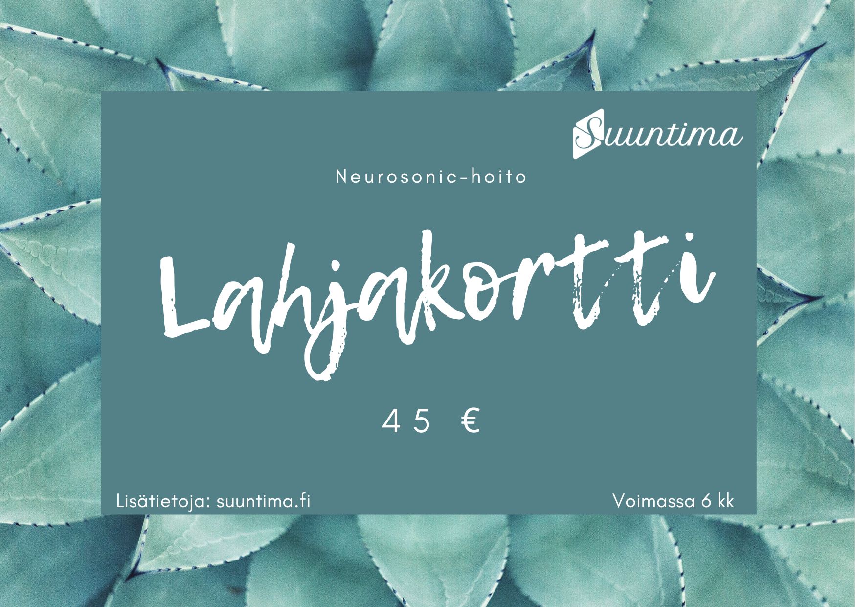 Lahjakortti käy vapaavalintaiseen Suuntiman Neurosonic-hoitoon. Lahjakortti on voimassa 6kk ostopäivästä.