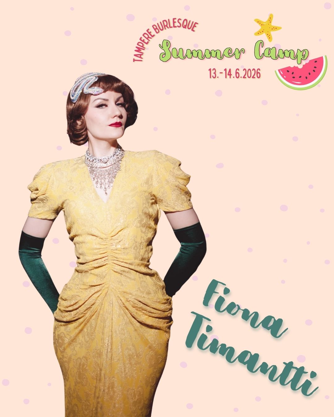 Fiona Timantti on ammatiltaan modistimestari, suunnittelija, ompelija ja puvustaja. Hän on Suomen ensimmäisen neo pin up makeover studion PinUpHelsingin stylisti ja perustajajäseniä. Hän toiminut burlesque djnä vuodesta 2007 ja ollut Suomen skenessä mukana uuden aallon alusta saakka. Kesäleirillä Fiona luennoi keinokuituperuukeista ja kertoo omat niksinsä mm.muotoiluun, pukemiseen ja säilytykseen. Luento sivuaa myös vintagekampauksia ja päähineitä. Kurssilla ei stailata omaa peruukkia, mutta saat tuhdin infopaketin ja opit alkeet välineistä, erilaisista peruukeista ja kuitujen käytöstä osana esiintymisasua. Voit halutessasi ottaa mukaan omat muistiinpanovälineet, mutta saat myös tiivistelmän luennon sisällöstä sähköisesti kurssin jälkeen. Jokainen kurssille osallistuva saa pienen lahjapussin, joka sisältää hyödyllisiä välineitä peruukkien stailaukseen. Luennolle osallistujien on myös mahdollista ostaa peruukin stailaus Fionalta erikoisen edulliseen hintaan.