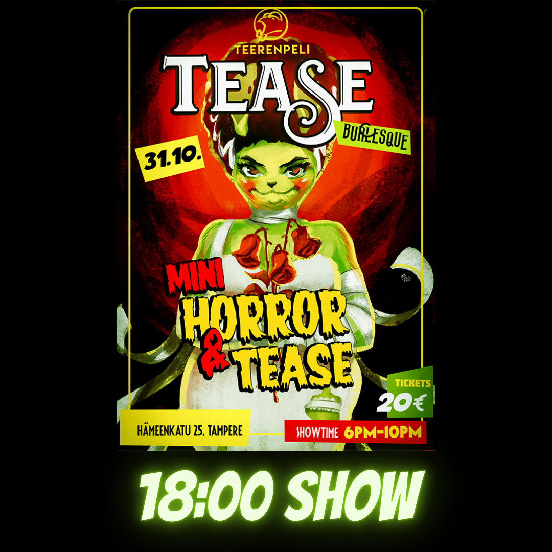 HUOM! PIDÄTÄMME OIKEUDEN TAPAHTUMAN MUUTOKSIIN COVID-19 TILANTEEN VUOKSI! "Mini Horror & Tease Show” Teerenpelin kellarissa tapahtuu jälleen ja tällä kertaa sukelletaan halloweentunnelmiin! Saavu siis juhlistamaan lauantai-iltaa ystävien kera, sillä Teerenpelissä sinut otetaan lämmöllä vastaan. Tule nauttimaan mahtavista esityksistä, hyvästä musiikista ja herkullisista drinkeistä kera huikean viihdekattauksen!