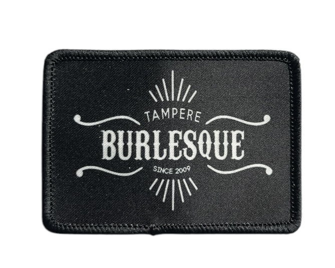 Musta kangasmerkki valkoisella logolla. Koko 5 x 7cm