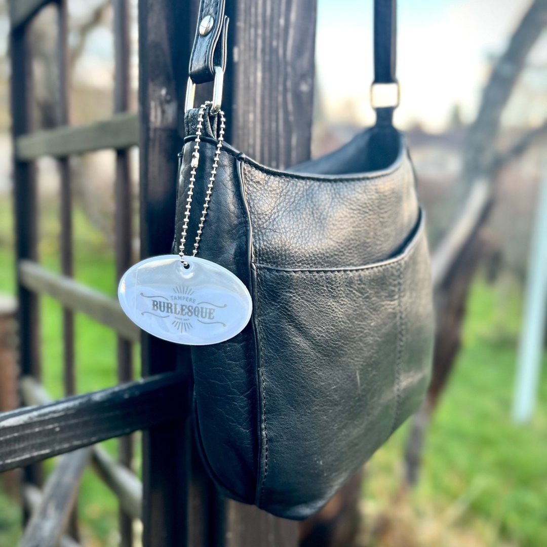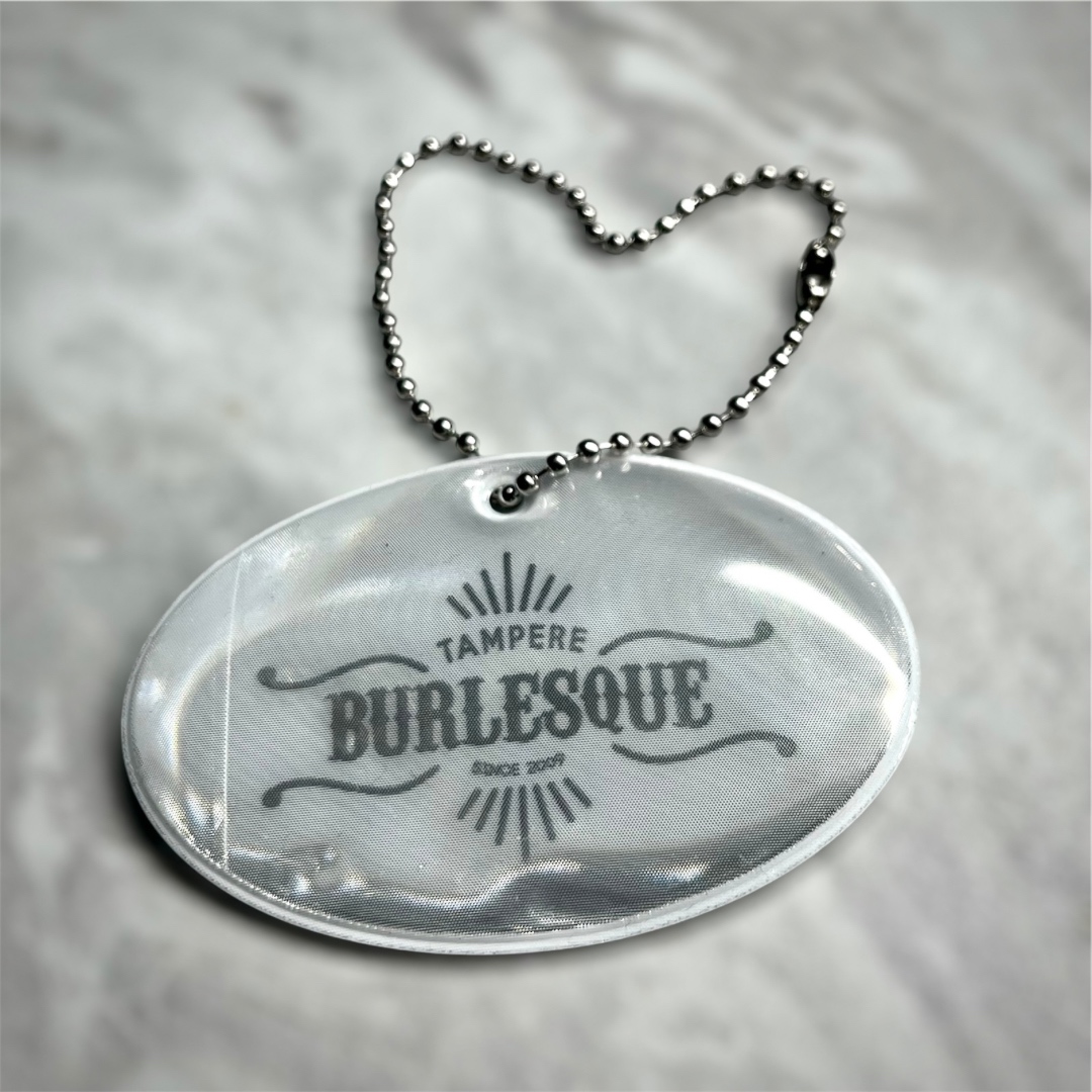Tampere Burlesque reflector with double-sided print. Width 6cm, ball chain.