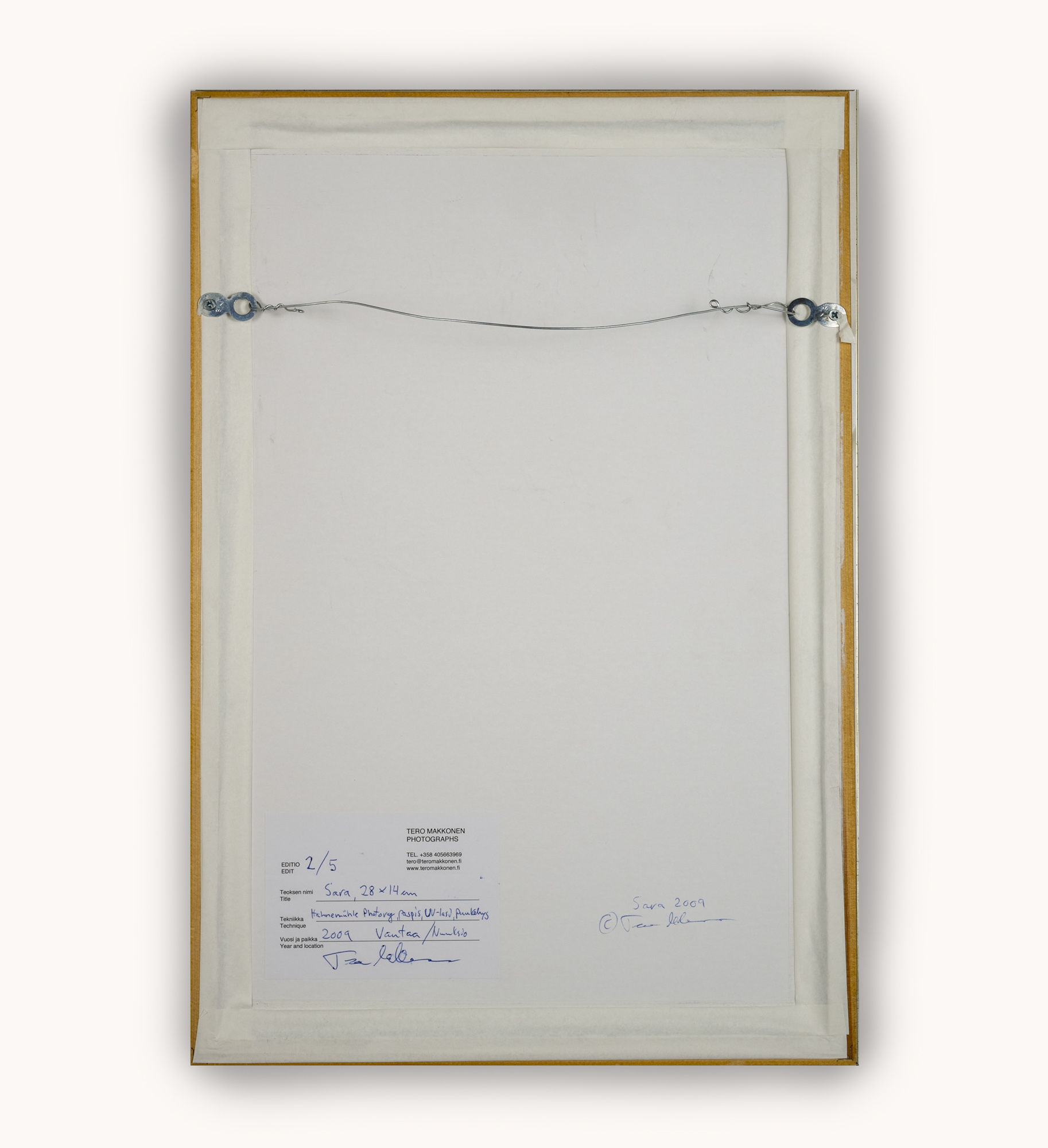 Sara, heinäkuu 2009. Sarjasta Kauniit maasta nousevat. Kuvan koko 14 x 28 cm, kehystettynä 19 x 33 cm. Hahnemühle Photorag -happovapaa paperi. Kehys Werner hopea-vihreä, heijastamaton ja UV-suojattu claryll-lasi. Kaikki materiaalit konservointilaatua.