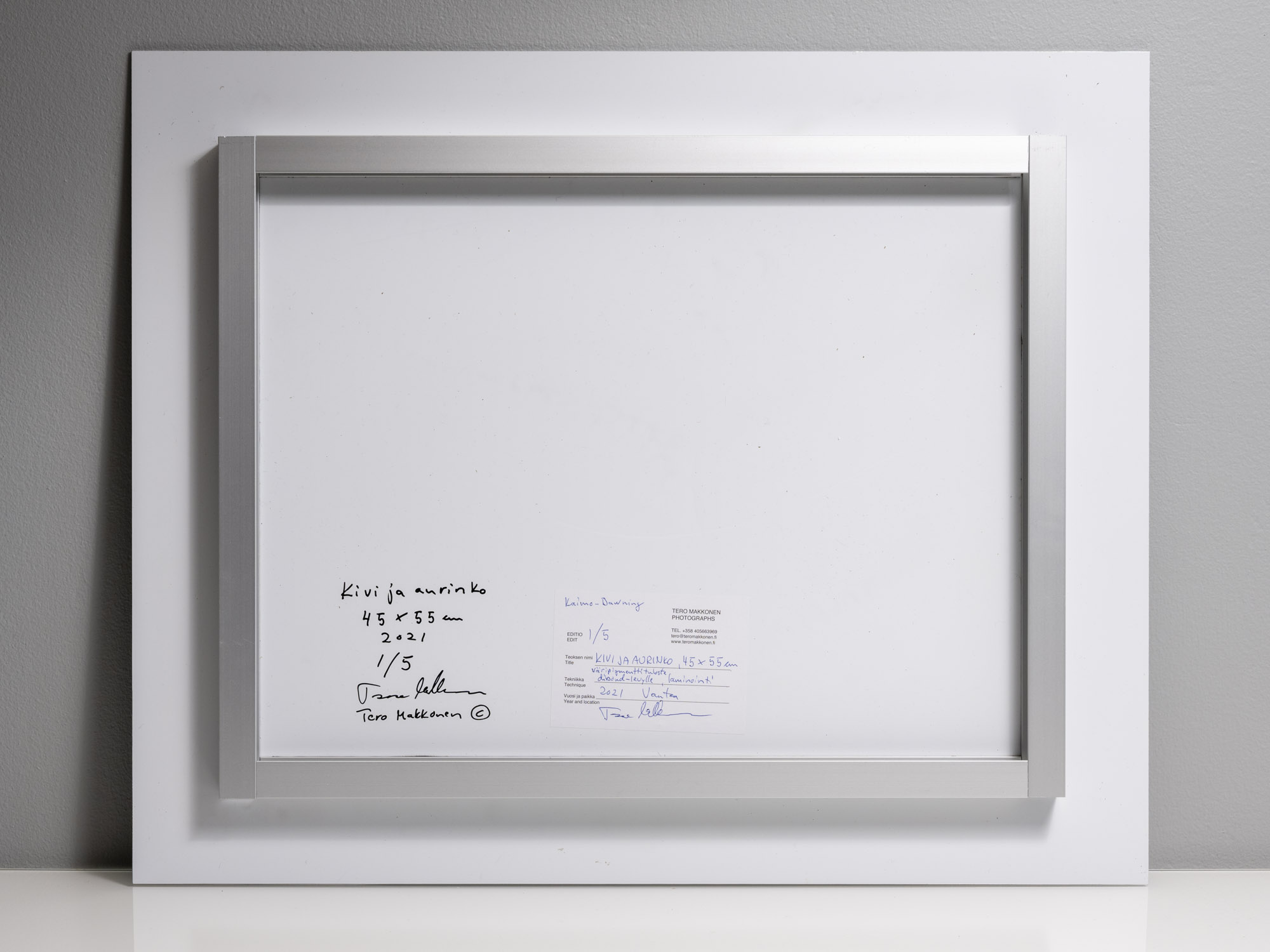Kivi ja aurinko, 45 x 55 cm, 2021, väripigmenttituloste. Pohjustettu dibond- alumiinikomposiittilevylle. Suojalaminoitu eli suojattu UV-säteilyltä ja taulun pinta voidaan puhdistaa kostealla liinalla. Editio 5, taulu 1/5.