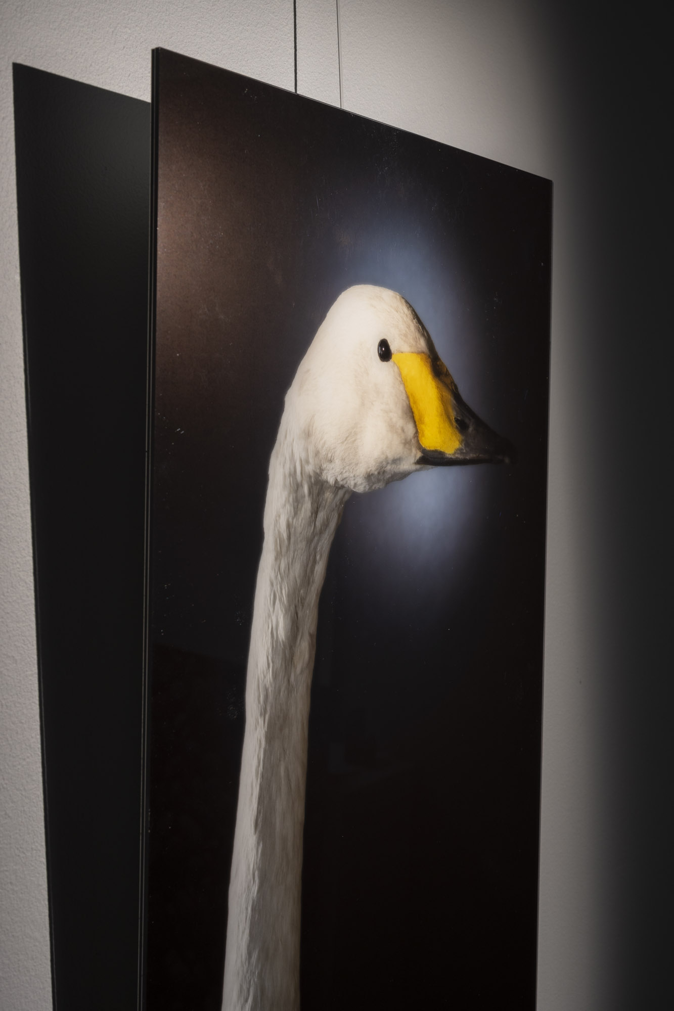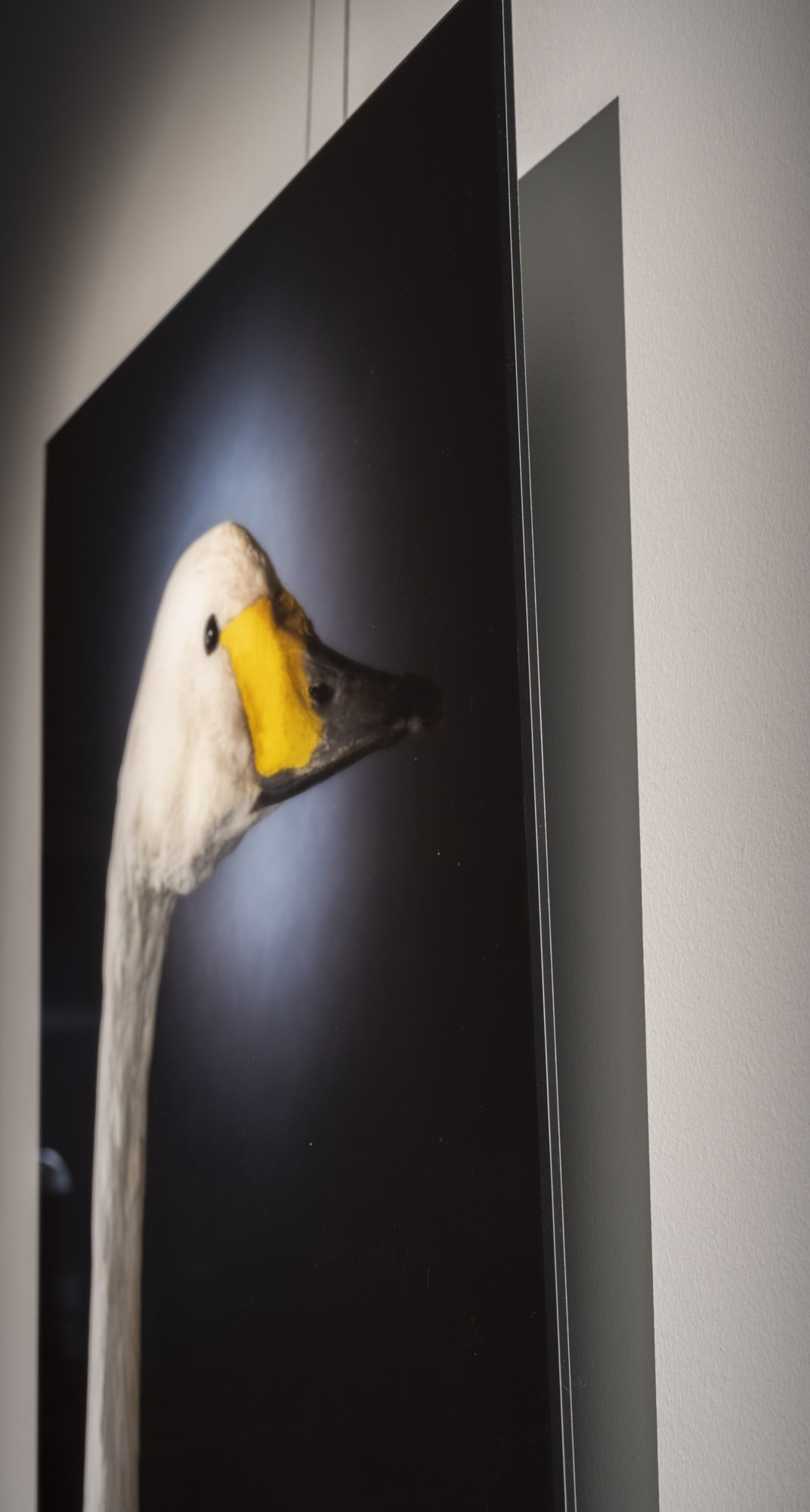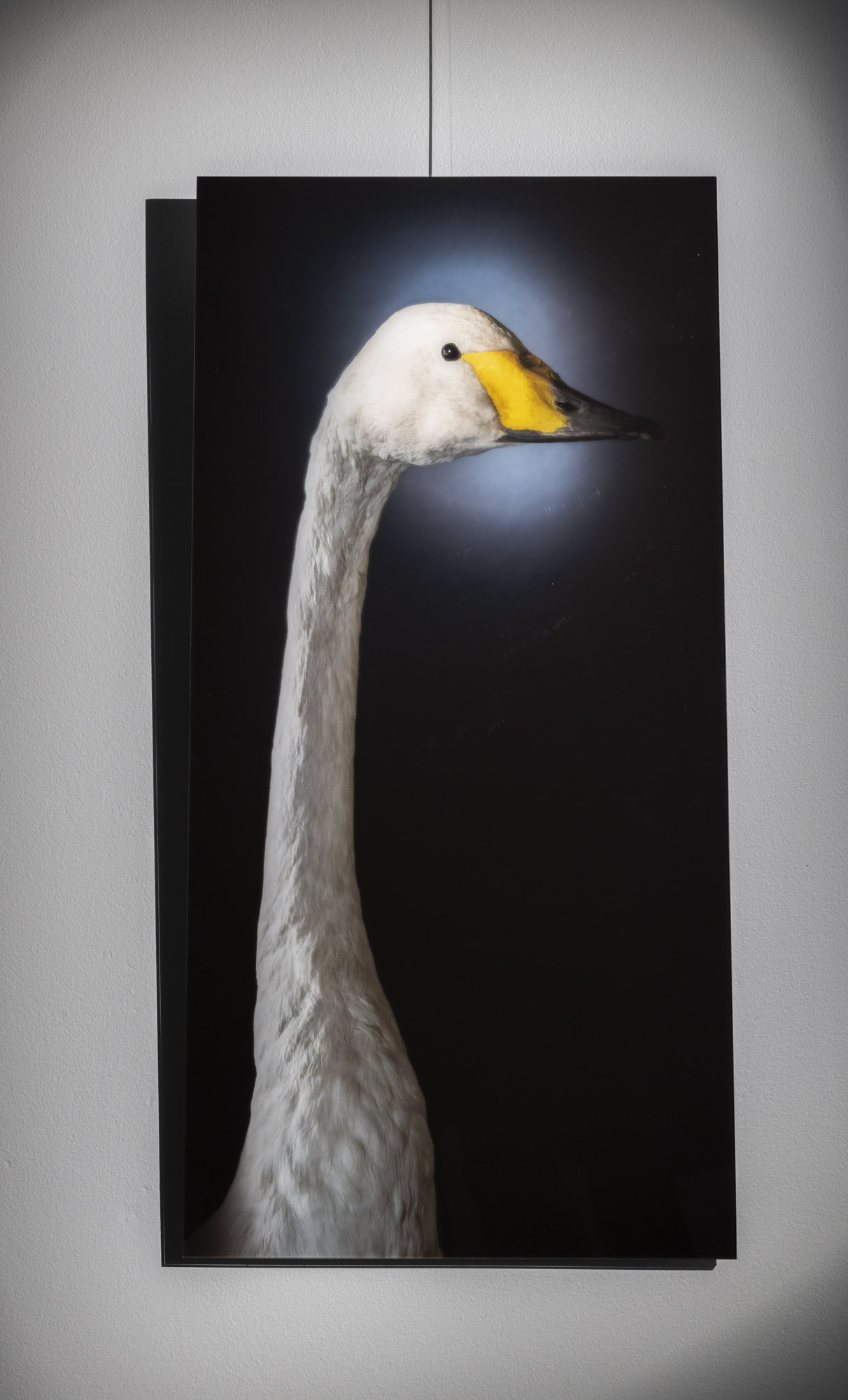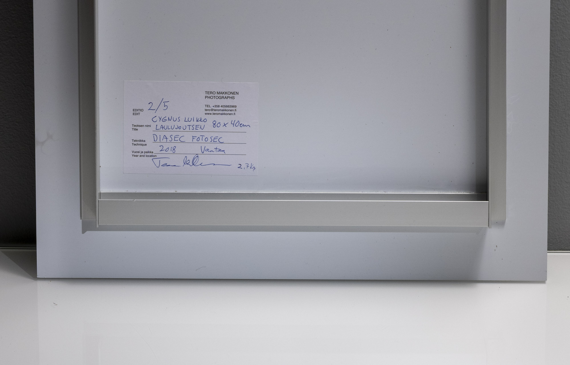 Cygnus Luikko, laulujoutsen, 80 x 40 cm, valokuva pohjustettu 7mm akryylilevylle Diasec, taulun paino 2,7 kg.
