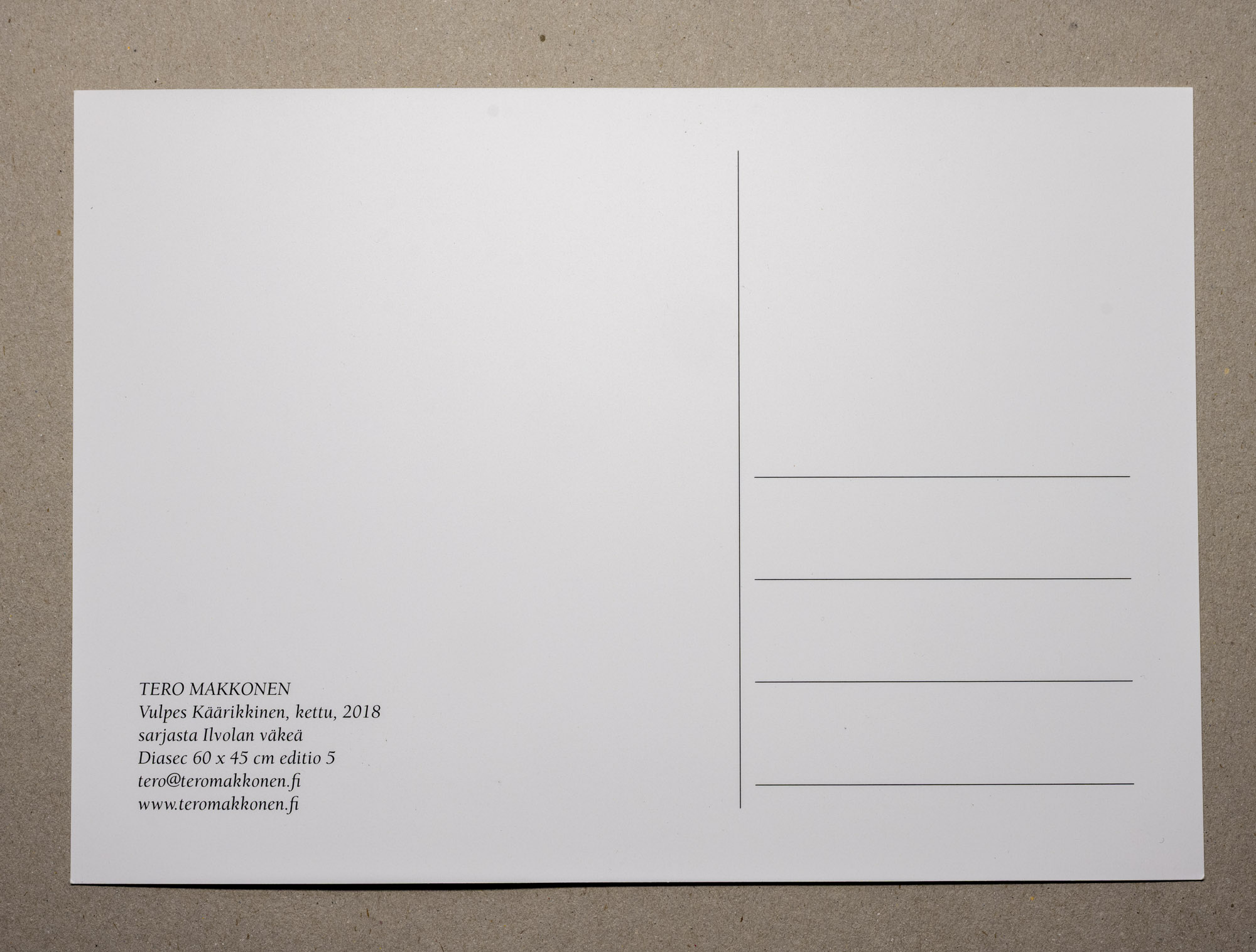 Vulpes Käärikkinen, kettu, 2018 14,8 x 21 cm Taidepostikortti Ilvolan väkeä -sarjan valokuvateoksista, kartonki. Huom! Toimitus sisältyy hintaan.