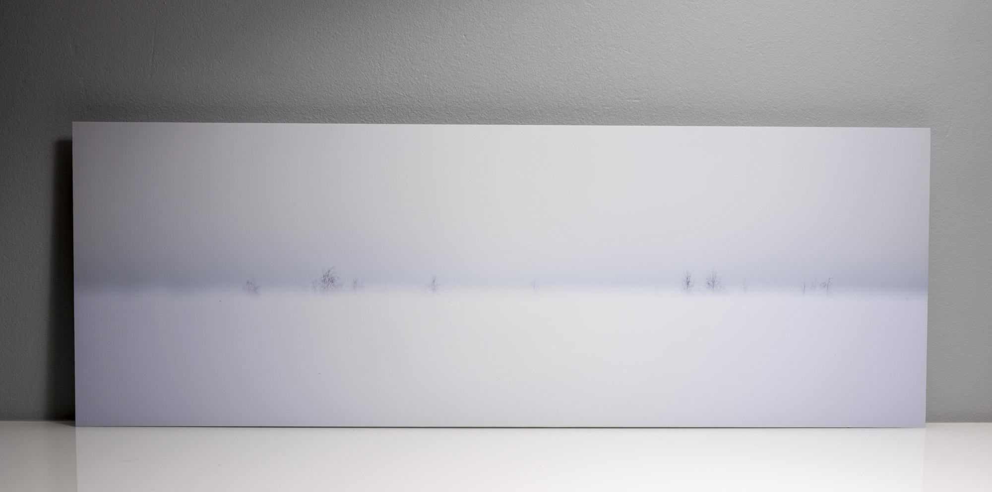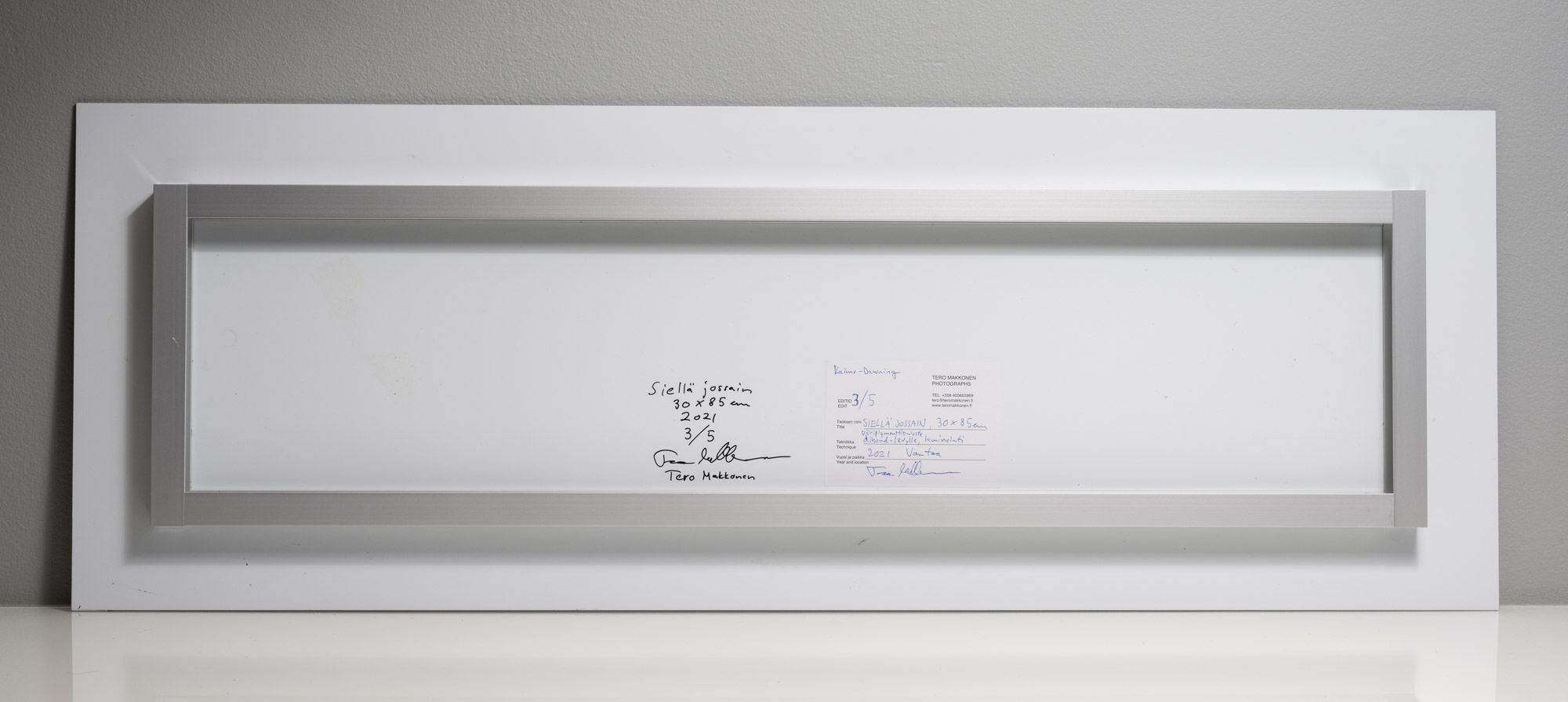 Siellä jossain, 30 x 85 cm, 2021, väripigmenttituloste. Pohjustettu dibond- alumiinikomposiittilevylle. Suojalaminoitu eli suojattu UV-säteilyltä ja taulun pinta voidaan puhdistaa kostealla liinalla. Editio 5, taulu 3/5.