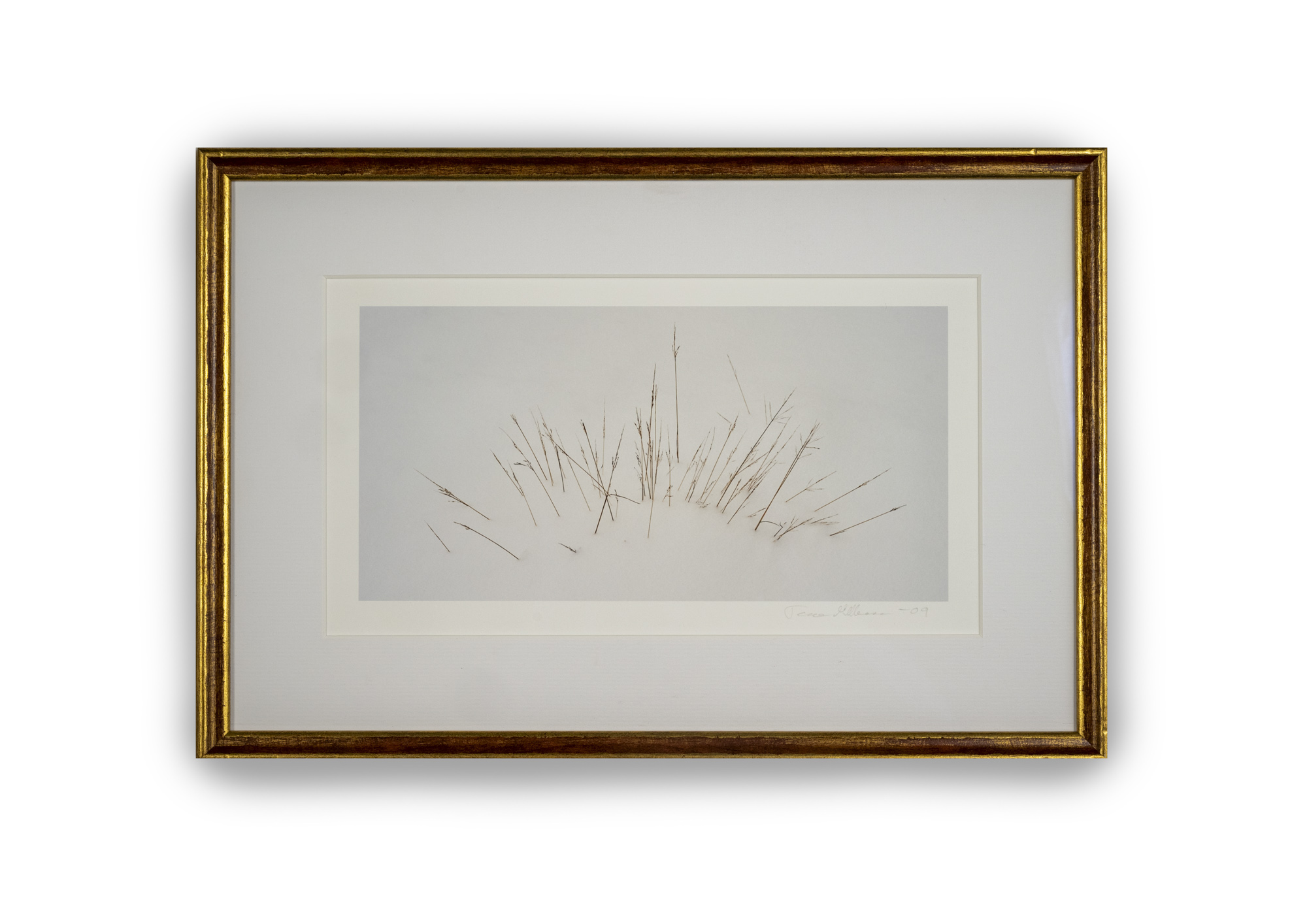 Talviheinät, helmikuu 2009. Sarjasta Kauniit maasta nousevat. Kuvan koko 14 x 28 cm, kehystettynä 19 x 33 cm. Hahnemühle Photorag -happovapaa paperi. Kehys L&J punakulta, heijastamaton ja UV-suojattu claryll-lasi. Kaikki materiaalit konservointilaatua.