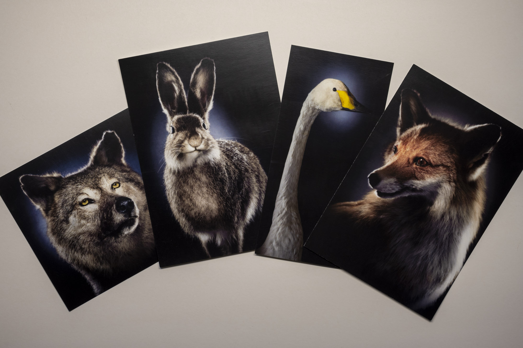4 kpl sarja taidepostikortteja Ilvolan väkeä -sarjan valokuvateoksista, kartonki kettu, jänis, susi ja laulujoutsen koot 14,8 x 21 cm, 10,2 x 21 cm