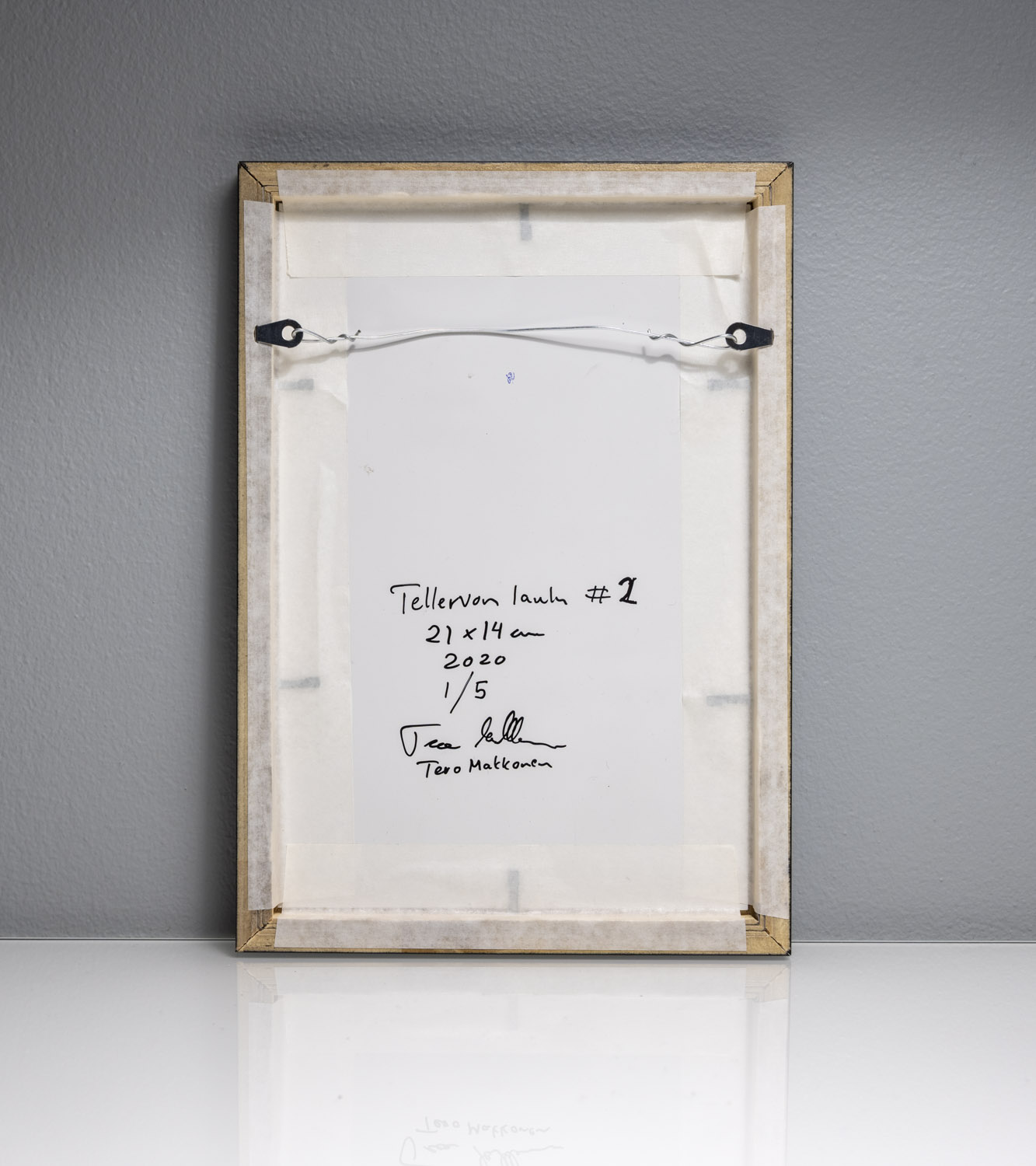 Tellervon laulu #2, 21 x 14 cm. Väripigmenttituloste, dibond, mattalaminointi, puukehys. Taulun pinta voidaan puhdistaa kostealla liinalla. Editio 5, taulu 1/5.