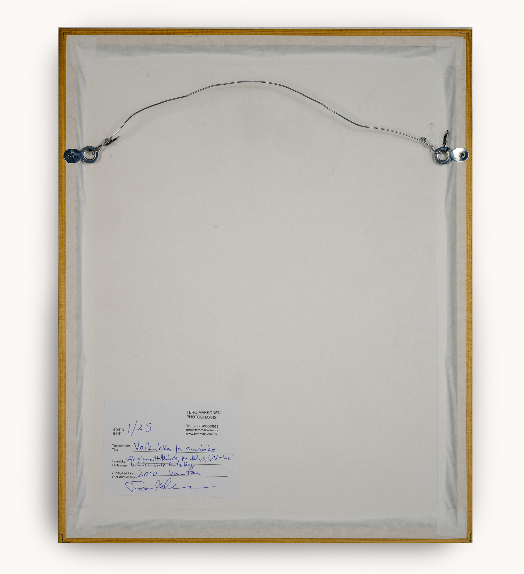 Voikukka ja aurinko, kesäkuu 2010. Kuvan koko 16 x 24 cm, kehystettynä 21 x 29 cm, Hahnemühle Photorag -happovapaa paperi. Kehys Werner hopea-vihreä, heijastamaton ja UV-suojattu claryll-lasi. Kaikki materiaalit konservointilaatua.