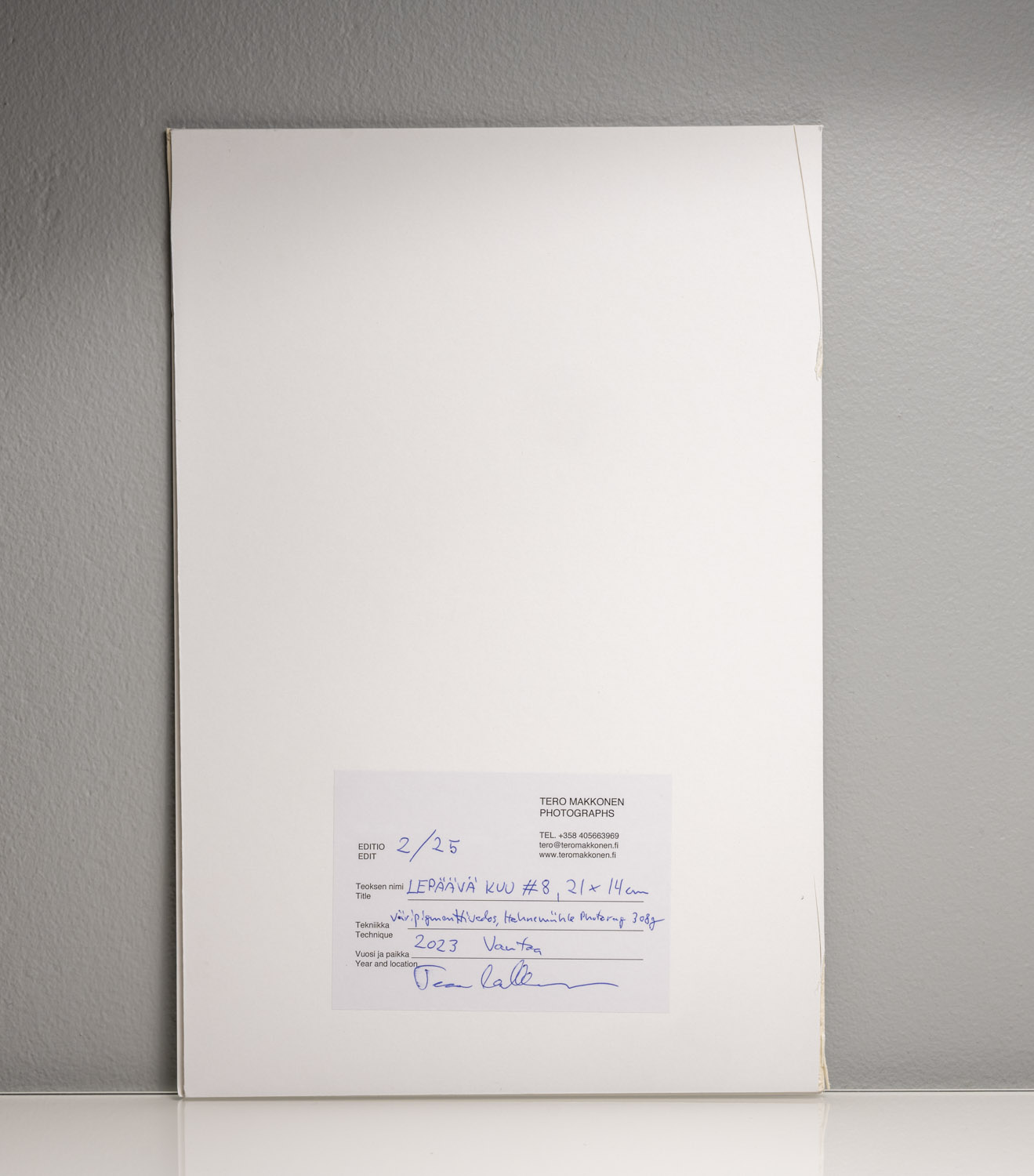 Lepäävä kuu #8, 21 x 14 cm, 2023. Valmiiksi pohjustettu mustavalkopigmenttituloste taustapahvilla ja paspartuurilla. Arkistokelpoiset ja happovapaat materiaalit. Sopii suoraan standardikehykseen kokoa 20 x 30 cm. Editio 25, vedos 2/25.