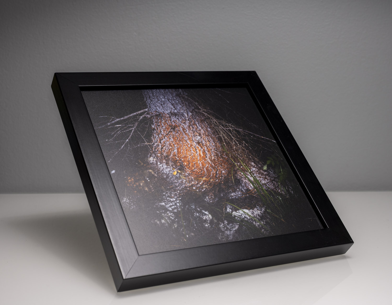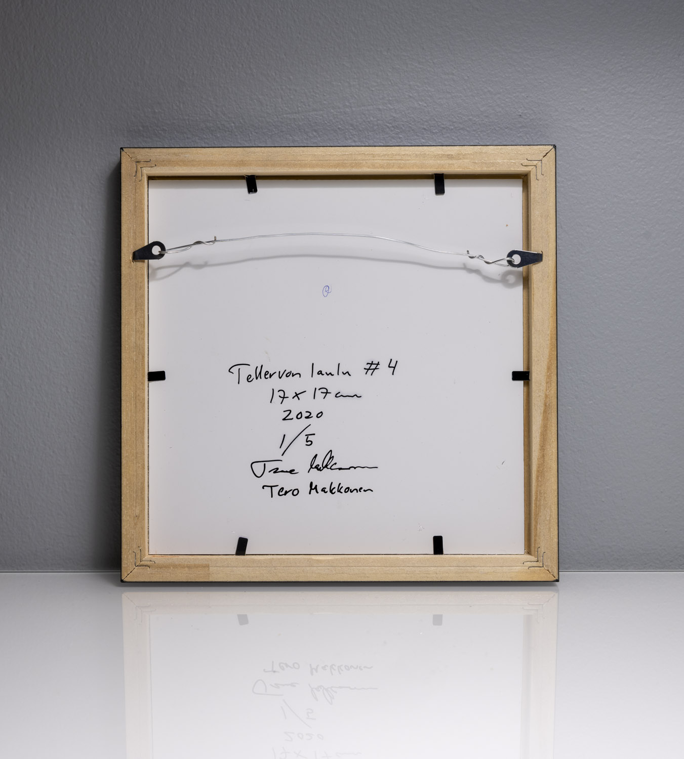 Tellervon laulu #4, 17 x 17 cm. Väripigmenttituloste, dibond, mattalaminointi, musta puukehys. Taulun pinta voidaan puhdistaa kostealla liinalla. Editio 5, taulu 1/5.