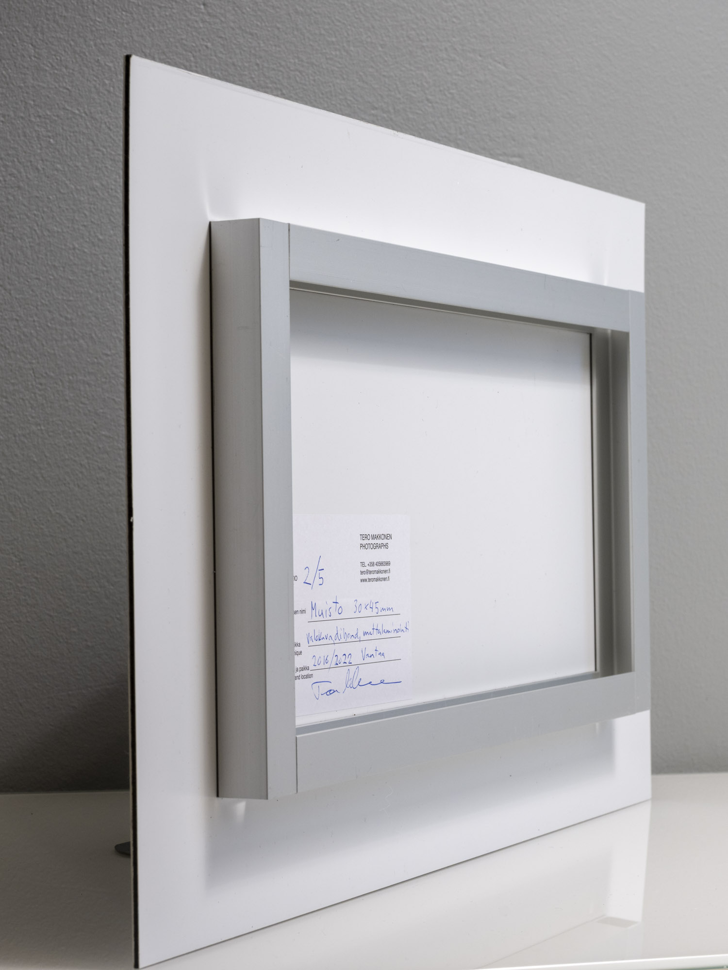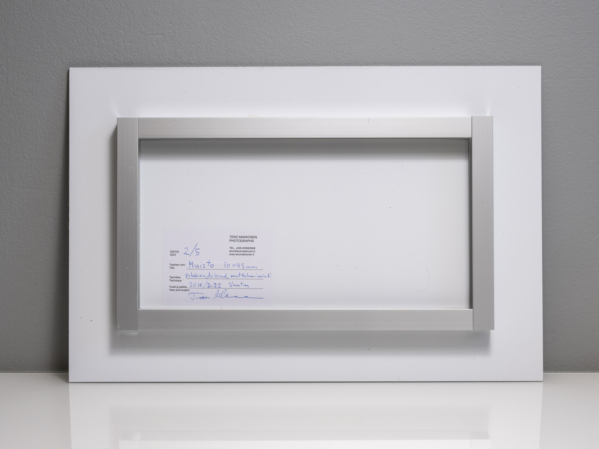 Muisto, 30 x 45cm, 2016. Valokuvataulu alumiinikomposiittilevylle, mattalaminoitu. Editio 2/5. Taulu kestää hyvin UV-säteilyä, eli voidaan ripustaa myös aurinkoiselle paikalle. Voidaan pyyhkiä kostealla liinalla.