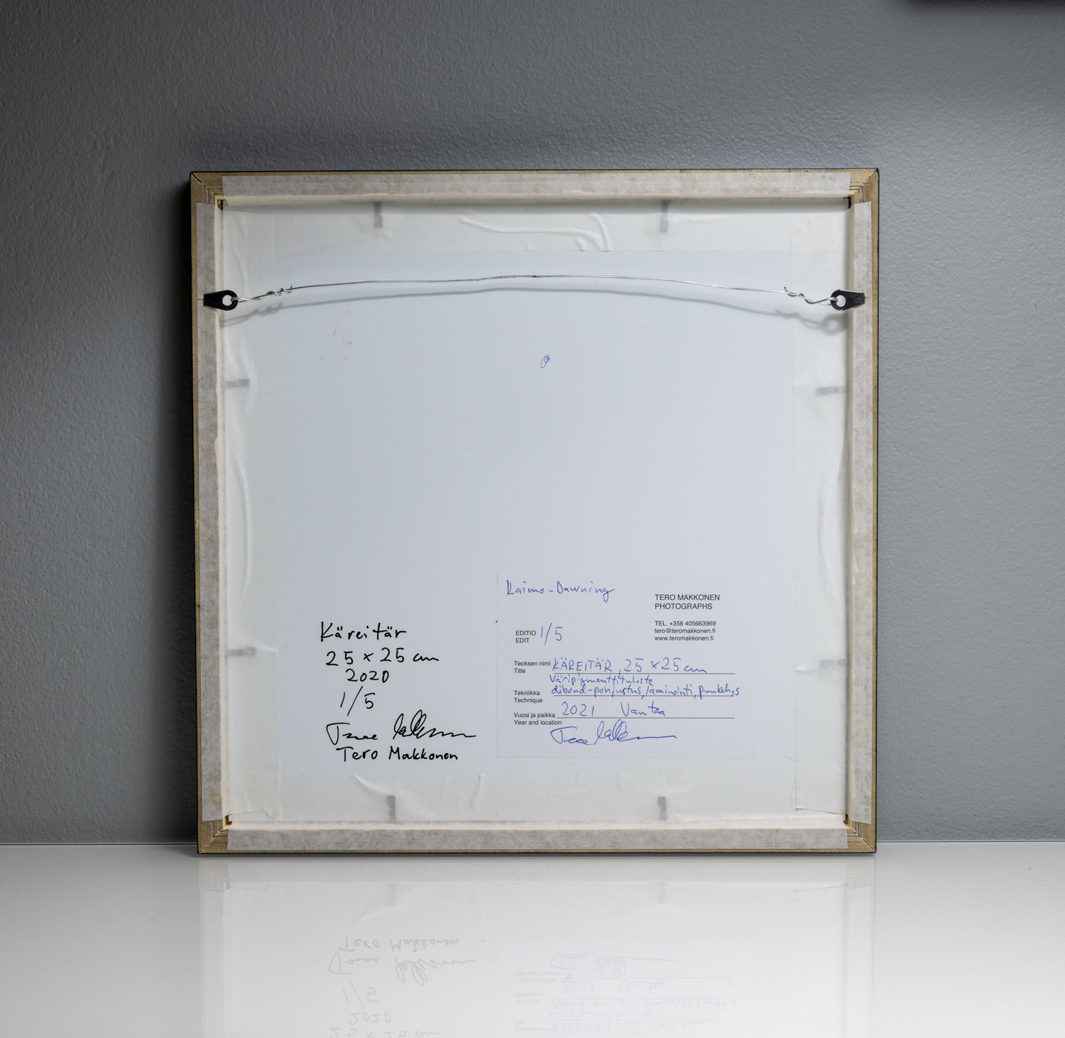 Käreitär, 25 x 25 cm, 2020, väripigmenttituloste. Pohjustettu dibond- alumiini-komposiittilevylle ja kehystetty mustalla puukehyksellä. Mattalaminoitu eli suojattu UV-säteilyltä ja taulun pinta voidaan puhdistaa kostealla liinalla. Editio 5, taulu 1/5.