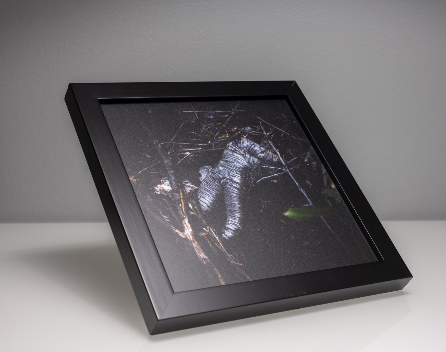 Tellervon laulu #5, 17 x 17 cm. Väripigmenttituloste, dibond, mattalaminointi, musta puukehys. Taulun pinta voidaan puhdistaa kostealla liinalla. Editio 5, taulu 1/5.