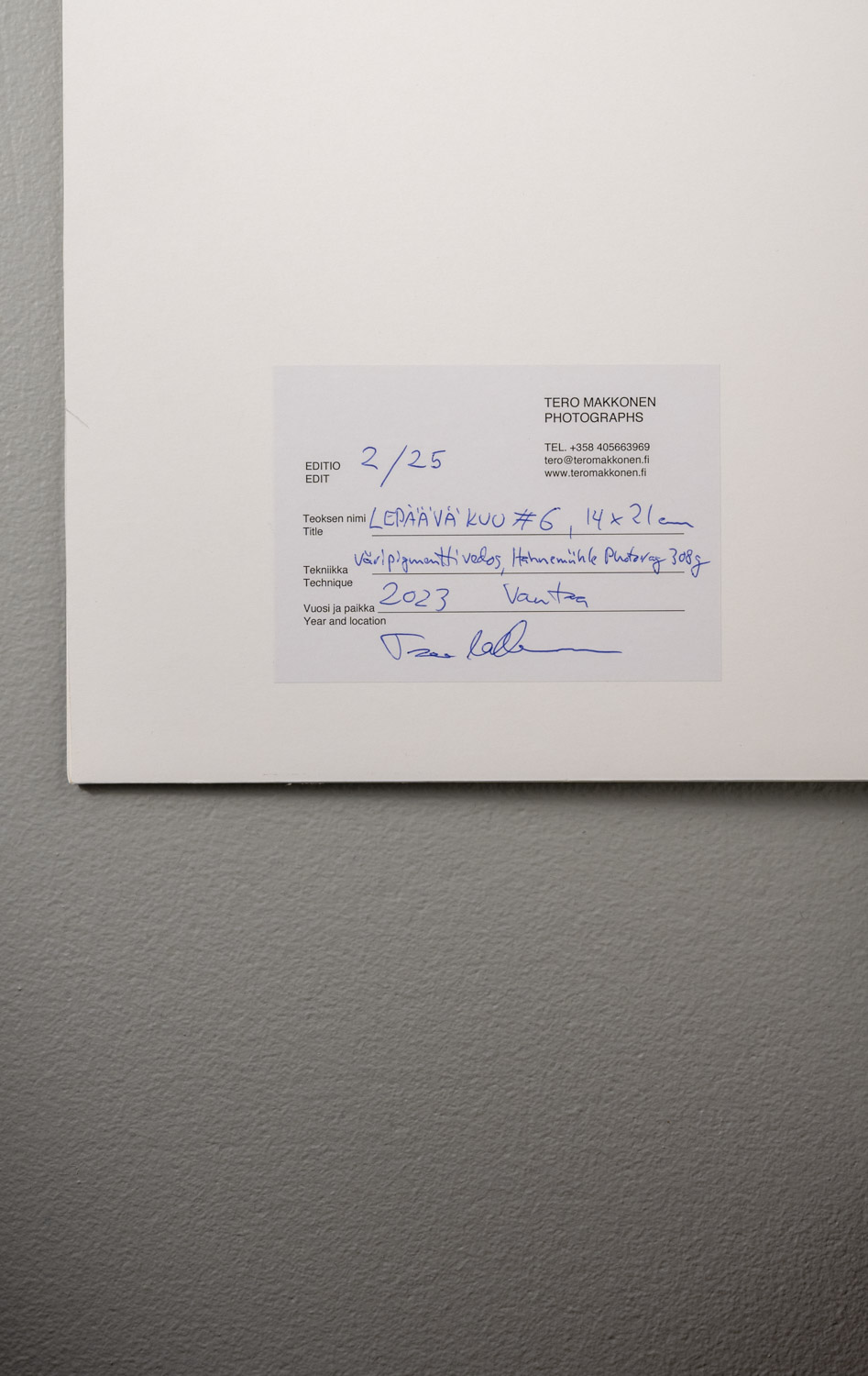 Lepäävä kuu #6, 14 x 21 cm, 2023. Valmiiksi pohjustettu mustavalkopigmenttituloste taustapahvilla ja paspartuurilla. Arkistokelpoiset ja happovapaat materiaalit. Sopii suoraan standardikehykseen kokoa 20 x 30 cm. Editio 25, vedos 2/25.
