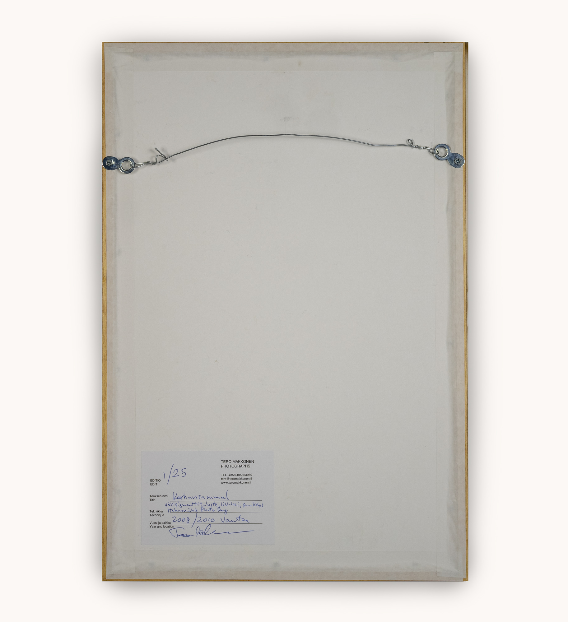 Karhunsammal, elokuu 2008 Kuvan koko 14 x 28 cm, kehystettynä 19 x 33 cm. Hahnemühle Photorag -happovapaa paperi. Kehys L&J punakulta, heijastamaton ja UV-suojattu claryll-lasi. Kaikki materiaalit konservointilaatua.