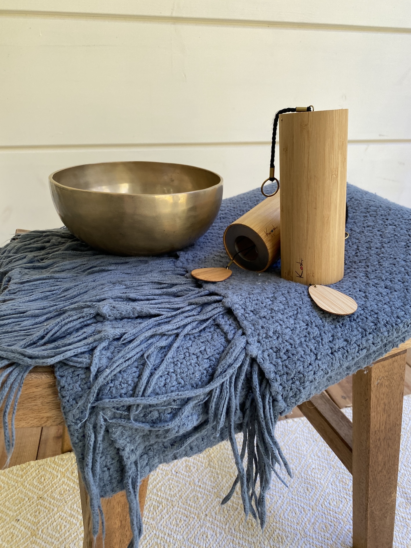 Mukana alustat ja iso pehmeäpäinen malletti sekä puukapula - kaiken mitä tarvitset aloittaaksesi äänimaljatyön!
