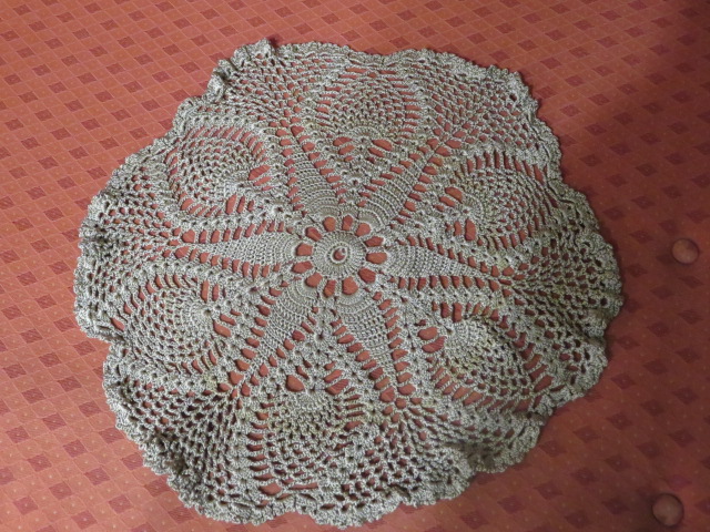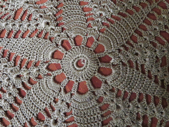 Virkattu Säteri langasta -70luvulla pyöreä liina. Halkaisija 40 cm.