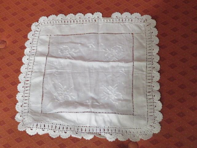 Kaunis vanha pikkuliina, jossa virkatut reunat ja valkokirjontaa keskellä. Koko 26x26 cm